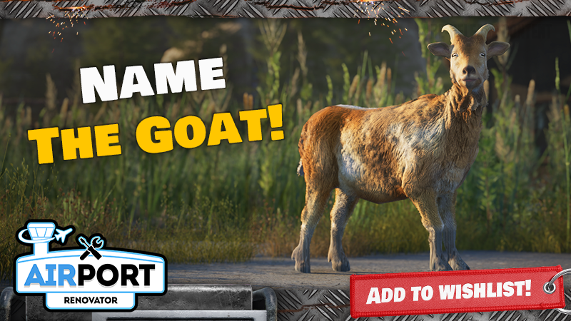 Hey renovators! We know you got fond of our parkour goat that you’ve encountered in the [b]Airport Renovator[/b] demo. It kinda grew on us too and we want to give her a bit more screen time in the future. That is why we are asking you to help us name it! Write your propositions in the comments and we will choose the one we like best.
