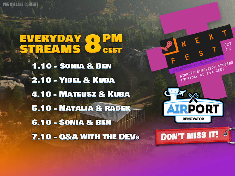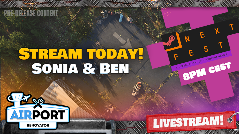 [b]Steam Next Fest [/b]starts now and we are more than excited to be launching our [b]Airport Renovator[/b] demo today at 7:00 PM! Download the demo and play it free, then join our live stream with Sonia and Ben tonight at 8:00 PM.