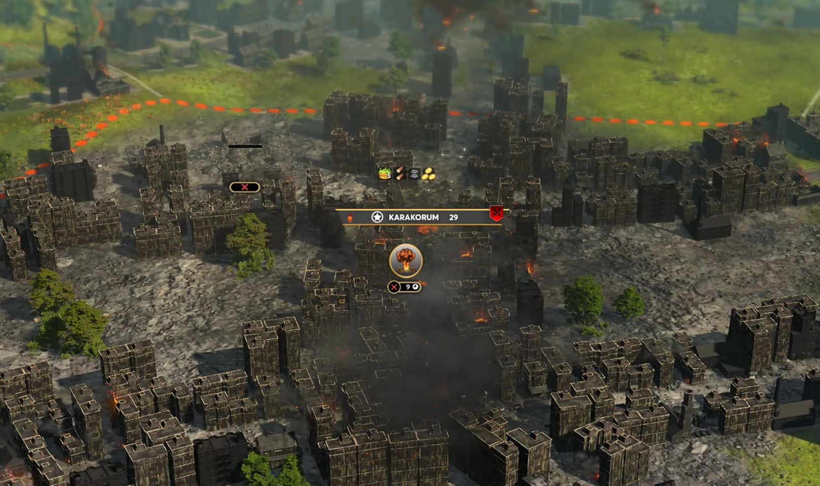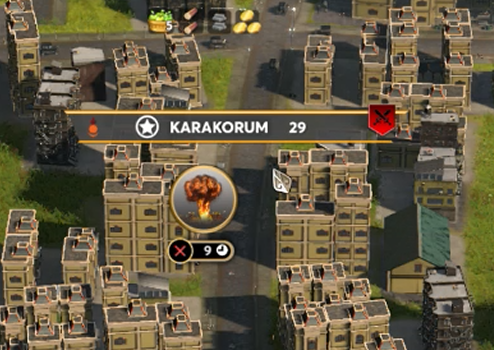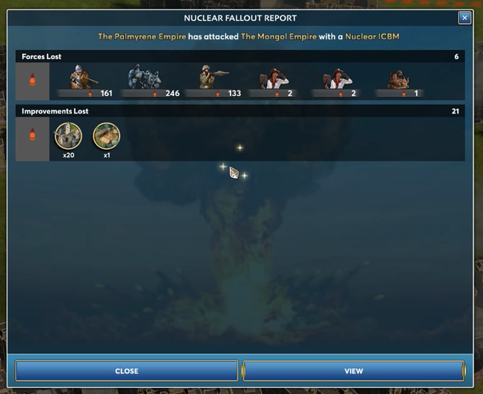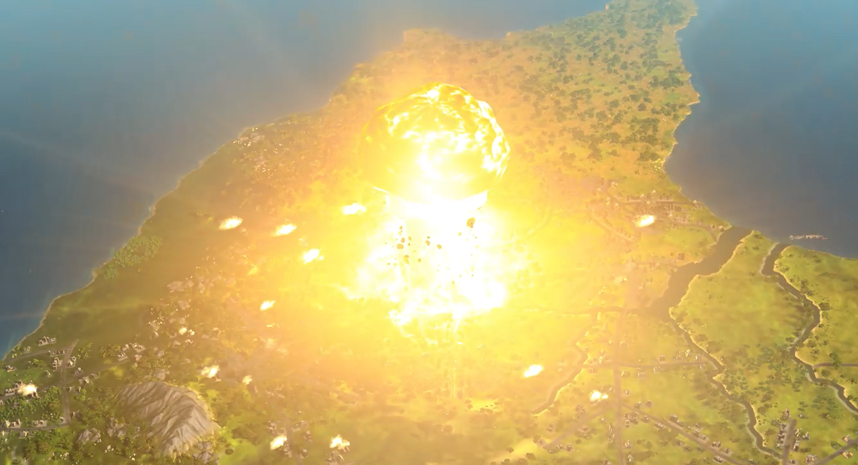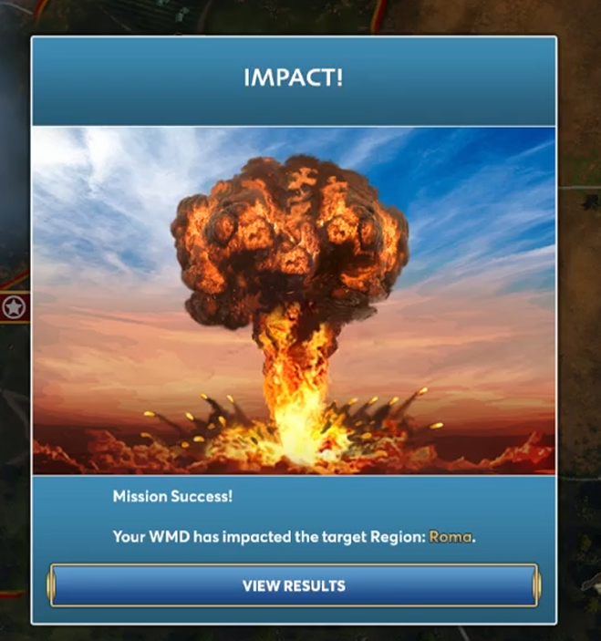 Nuclear strikes eliminate all units and improvements in the targeted region, leaving it—and adjacent regions—uninhabitable for several turns. However, expect severe diplomatic repercussions.