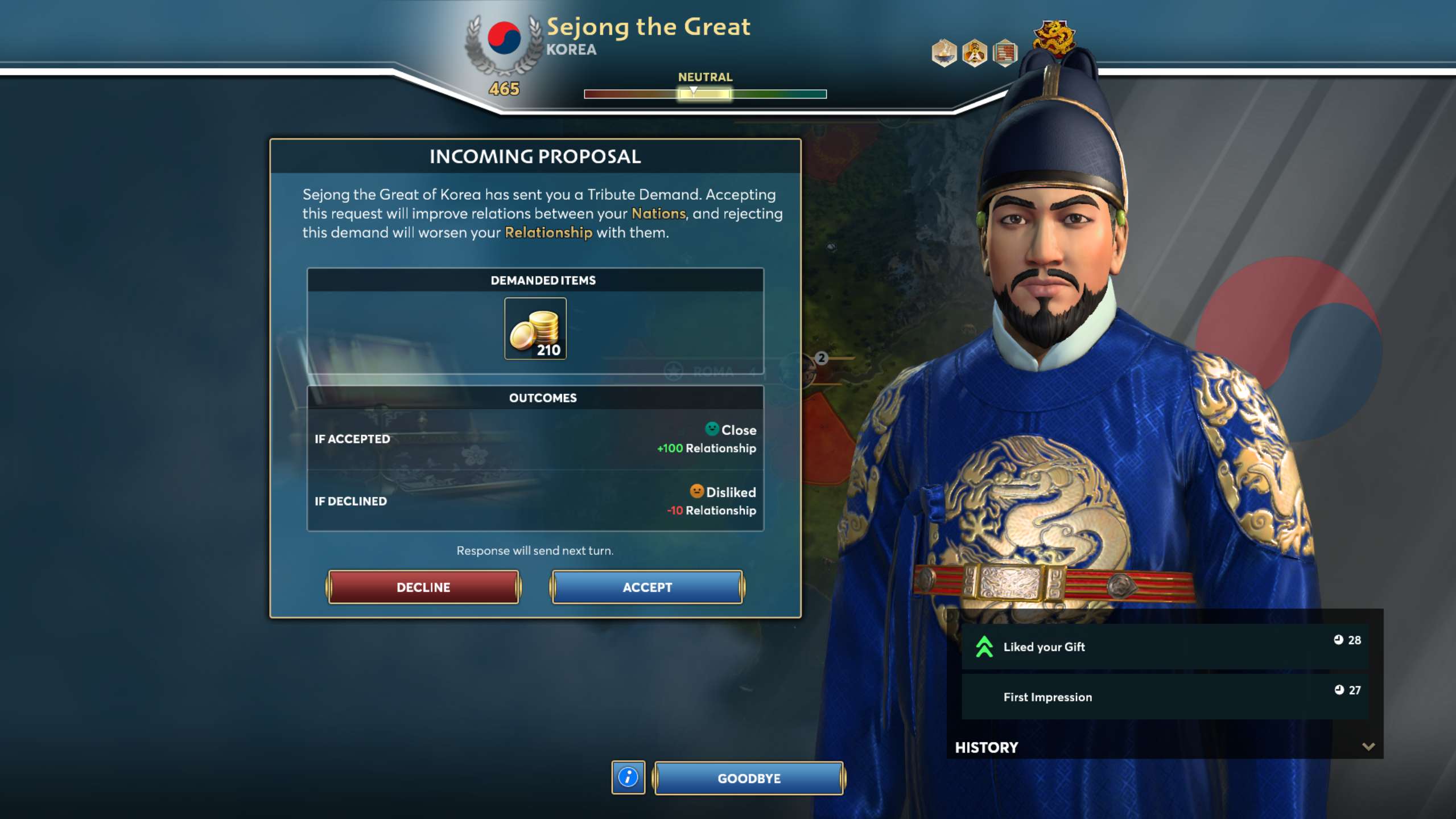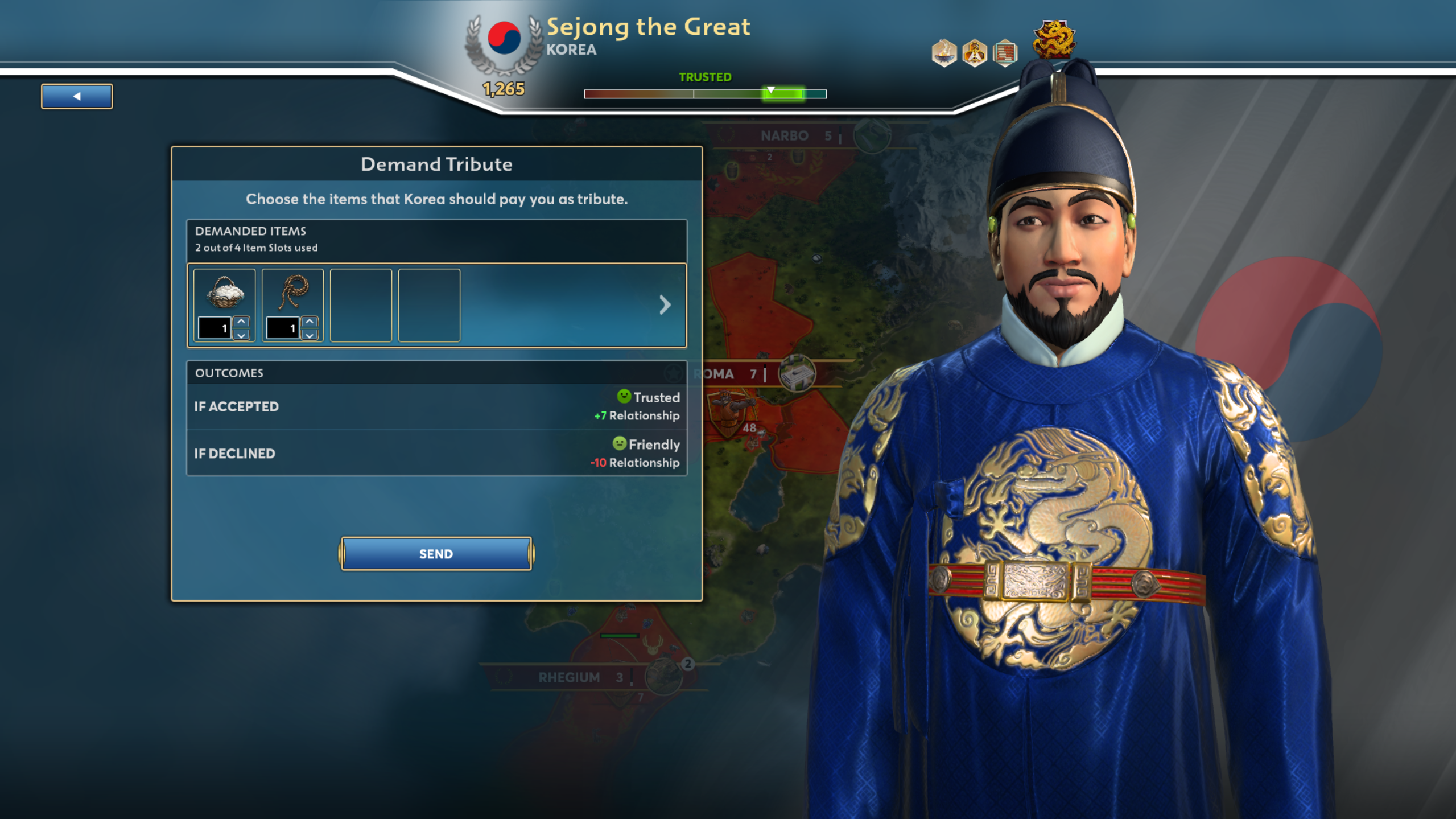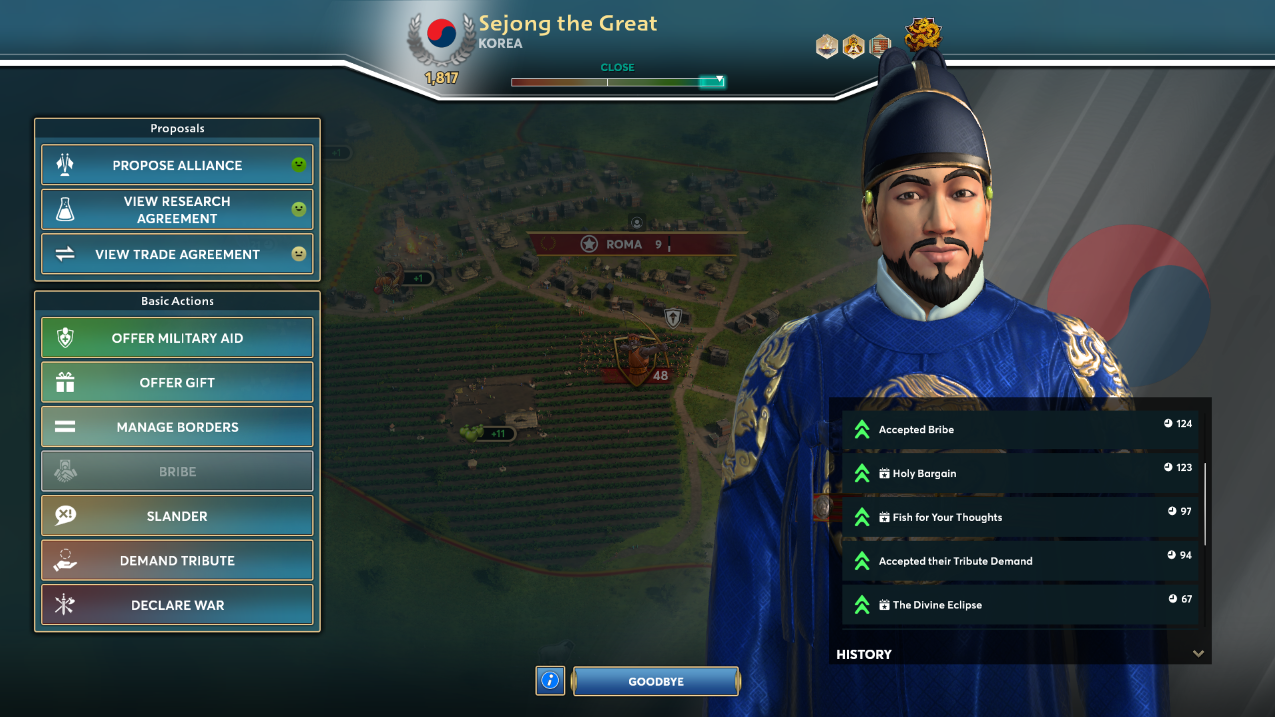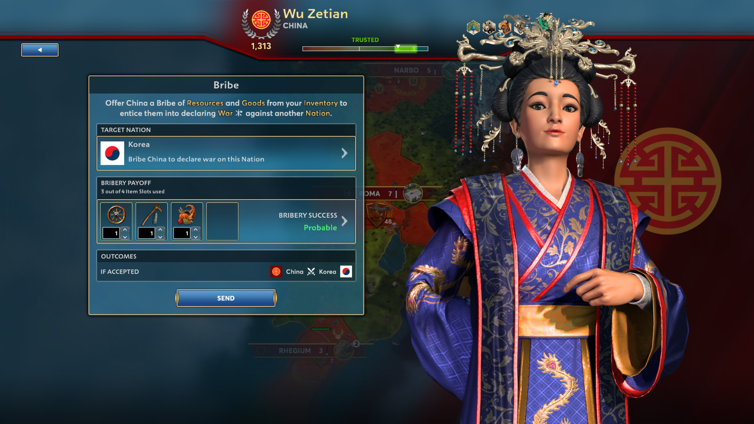 Bribery allows you to incite conflicts between other nations, leveraging existing tensions to your advantage. Early in the game, bribes can effectively set nations against each other, but as diplomatic relationships grow complex, manipulation becomes more challenging. Bribery, therefore, introduces another strategic layer, shaping historical rivalries and alliances.