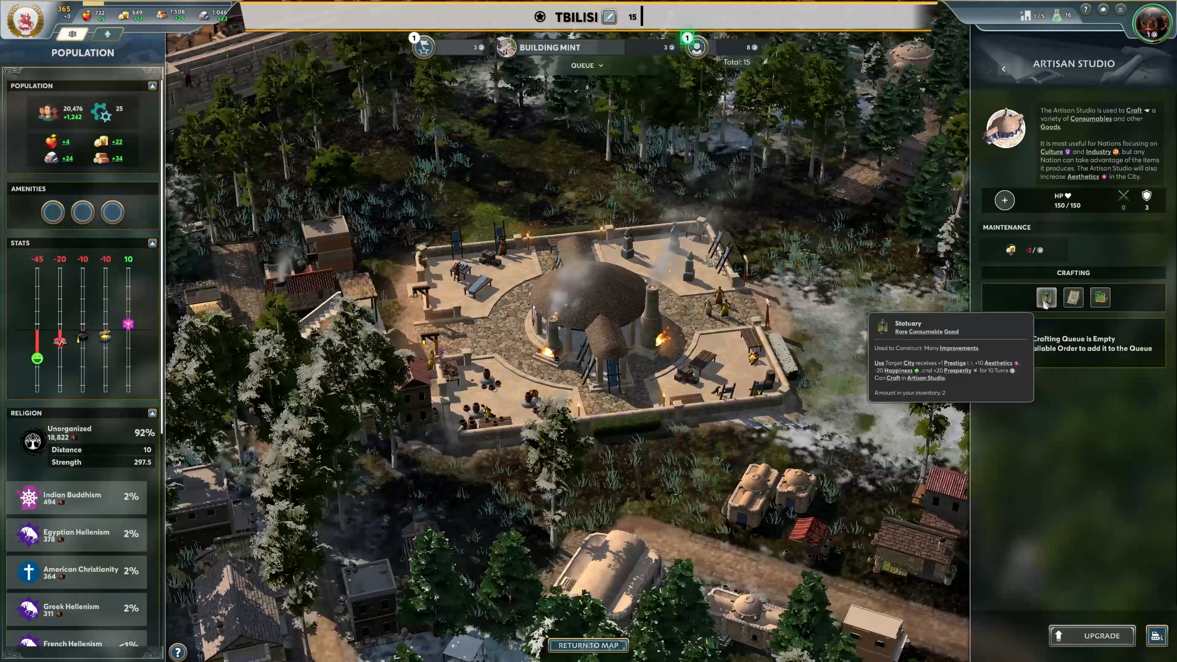 Engage with Ara’s Crafting System, a unique challenge rarely seen in the 4X genre. Crafting unfolds at a National scale, where players refine and combine harvested natural resources into various goods and components. Use these to construct Triumphs or enhance your citizens with strategic buffs!