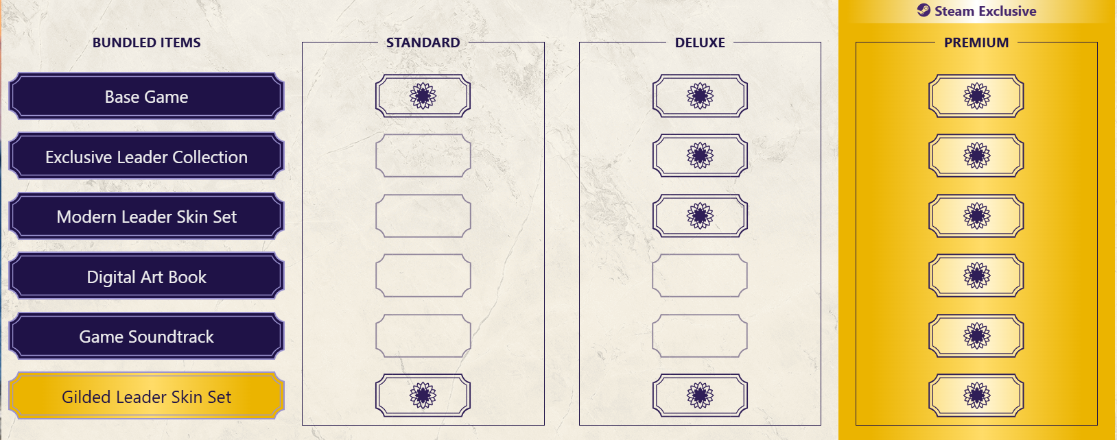 The Standard Edition of [i]Ara: History Untold[/i] offers the full base game, allowing you to immerse yourself in leading a nation from the beginning of recorded history to the Information Age and beyond. As a special bonus for those who pre-order, you’ll receive the [b]Gilded Leader Skin Set[/b]. This pre-order bonus adds a touch of luxury to your gameplay, allowing you to enhance five iconic leaders - Ashoka, Elizabeth I, George Washington, Sappho, and Yaa Asentewaa - with prosperity-themed golden costumes. These gilded skins are a celebration of their historical achievements, now reimagined with a luxurious twist.
