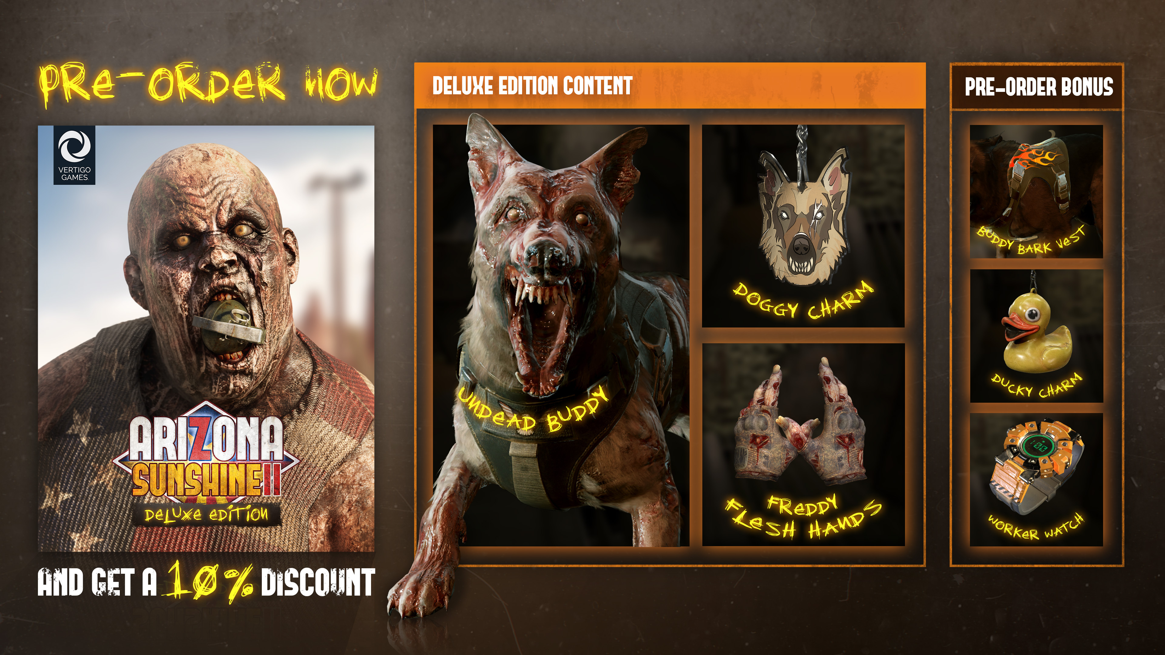 For those craving the ultimate Arizona Sunshine 2 experience, the Deluxe Edition is the way to go. Not only do you get a 10% pre-order discount and bonuses when pre-ordering this edition, it also includes the exclusive Freddy Hands Skin, Doggy Weapon Charm, and Undead Buddy—turning your loyal companion into an undead killing machine.