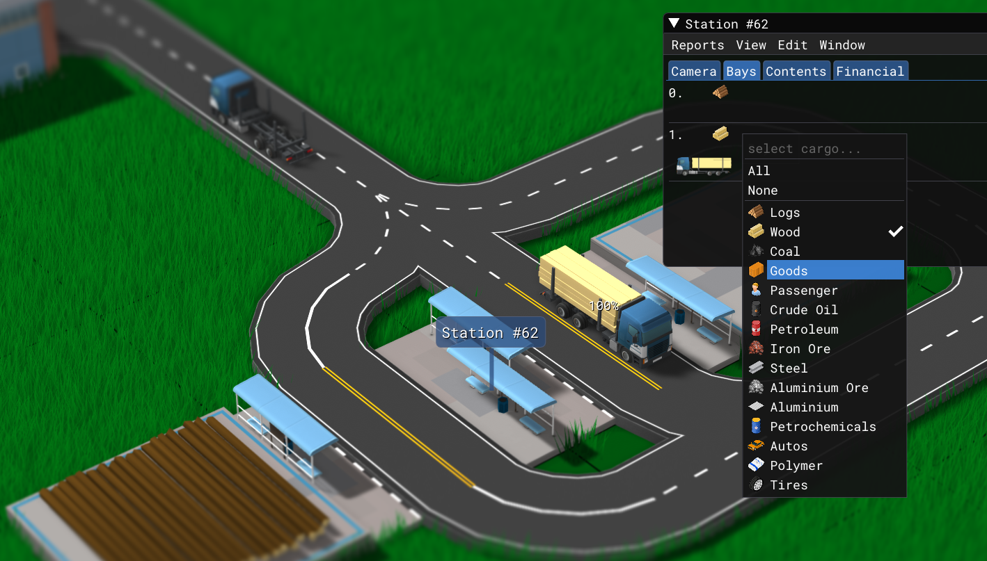 I also played around with new mechanics. One I am very pleased with is bay and cargo assignments. I started with the vehicles, allowing you to restrict what can be loaded. Let's say a wagon takes all kinds of ore, you can say "only accept coal". These settings are copied when you clone a vehicle. Then I expanded it to bays, making it really great to micro where you want road vehicles especially to go - allowing you to have a dedicated bay. I need to work on the UX for it a bit, but overall I think that direction really fitted well with wanting to make the stations more a "thing" in this game than others in the genre.