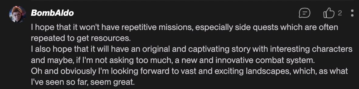 More than this, they're hoping for an original and captivating story with interesting characters and an innovative combat system.
