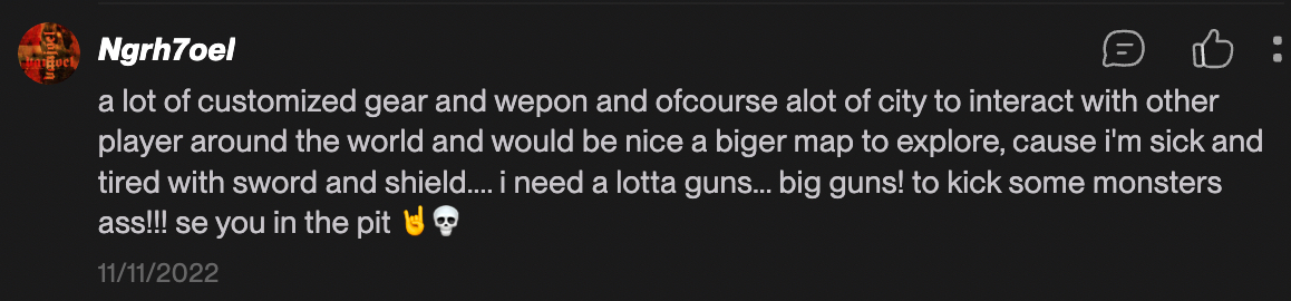 2.Some players are hoping there'll be many kinds of weapons and that they can take on some monsters with some unique guns since they're tired of sword and shield combat.
