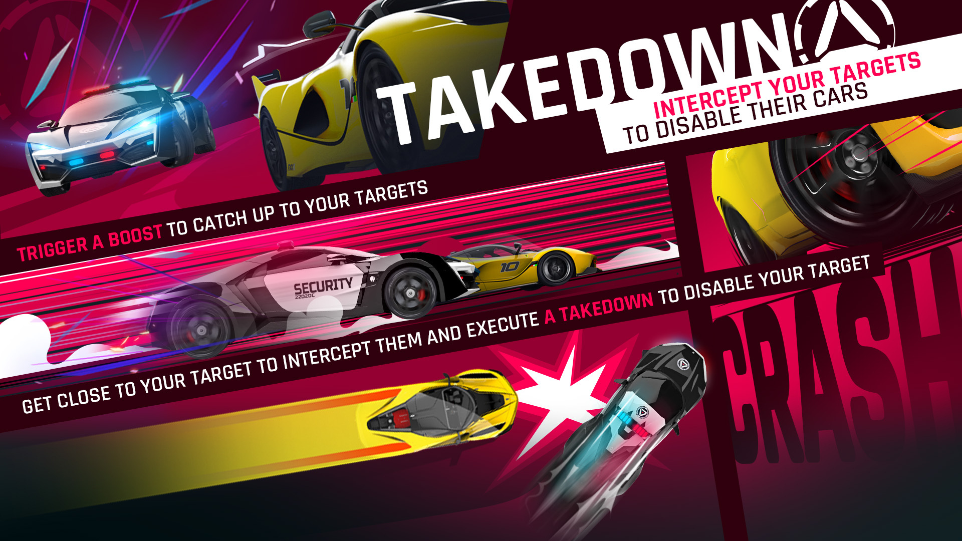 - Execute a takedown at the right time to eliminate opposing cars ahead of you OR time it right to spin into a 90-degree block to eliminate an opponent approaching from behind.