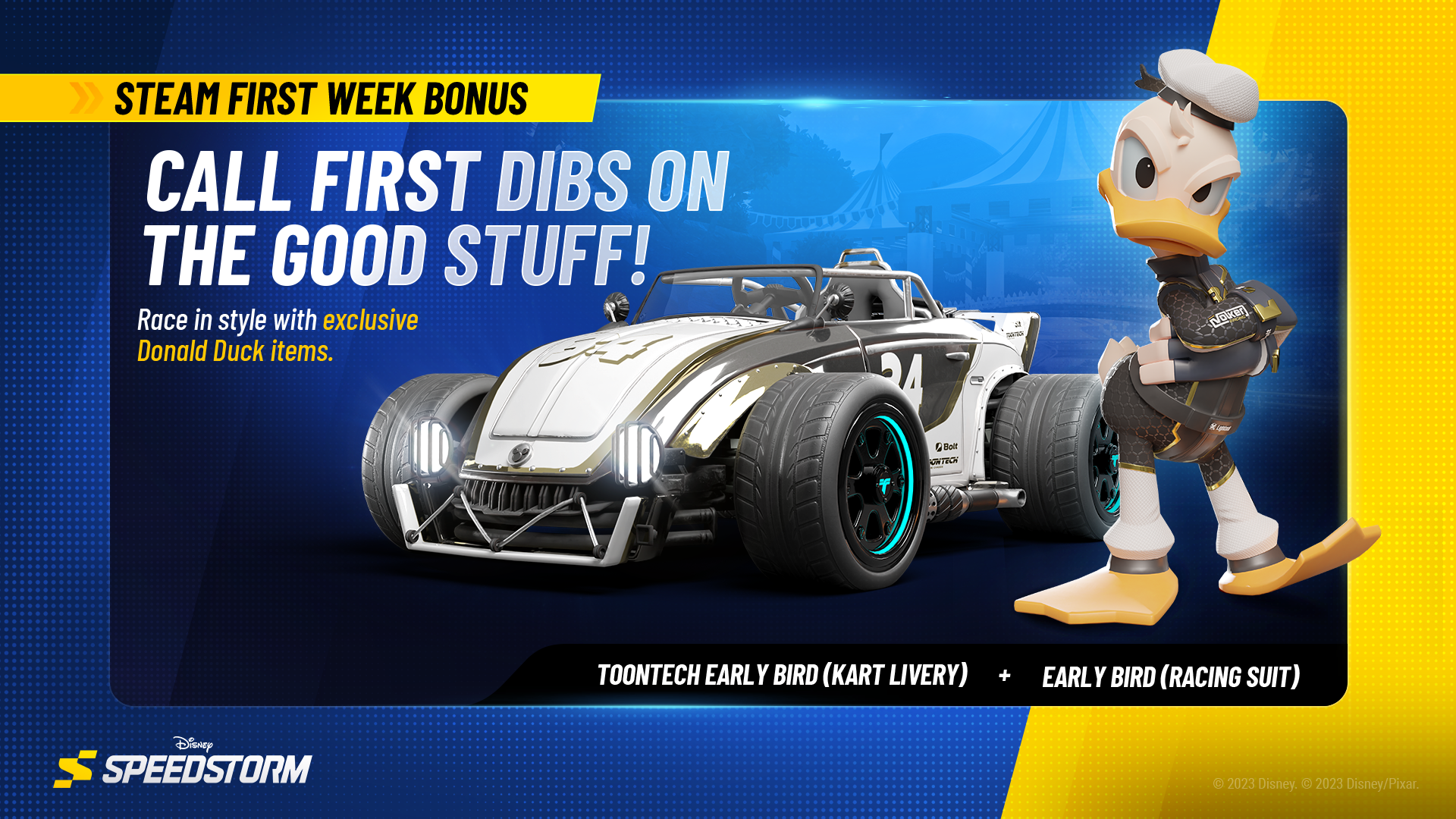 The exclusive Donald Duck cosmetics will be available to players that purchase on Steam during the first week of Launch as a First Week Bonus. which is why it is recommended to [url=https://disneyspeedstorm.com/stores]Wishlist[/url] the game now on Steam as a reminder and be first in line to get the game when it launches on April 18!