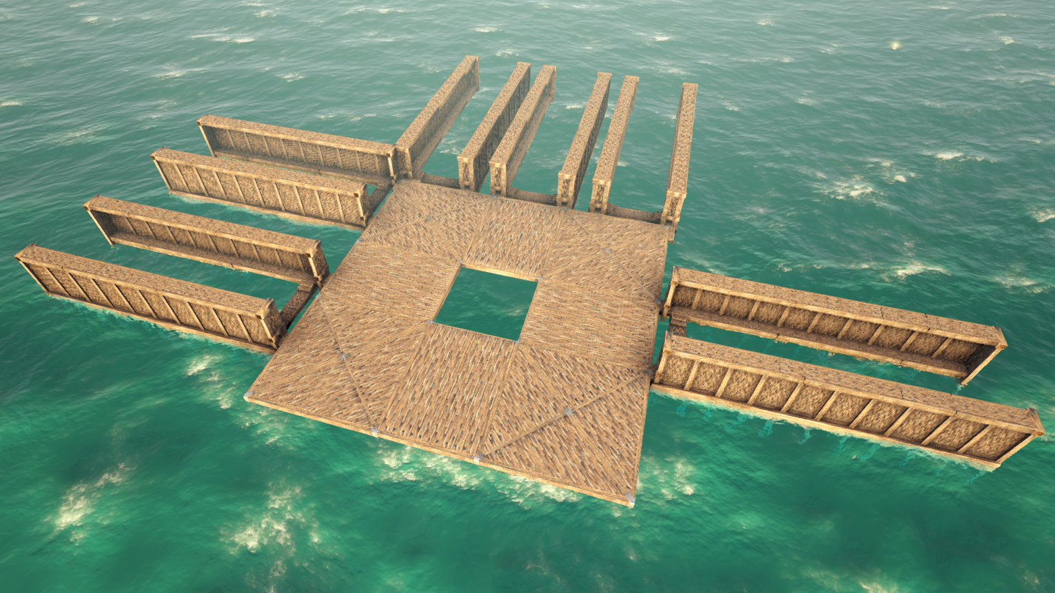 Floating Operating Bases (FOBs) introduce a whole new strategic system into Atlas where players are able to build temporary floating bases to stage their fleet. The foundation of the FOB is a large square with a hollow center. Along each side of the foundation are snap points for Sea Docks (max: 6), where player ships can be docked and protected. The foundation will provide support for all structures placed on it or connected to it up to 16 connections away, with no weight limit. There are, of course, limits on where FOB foundations can be placed to avoid potential griefing.