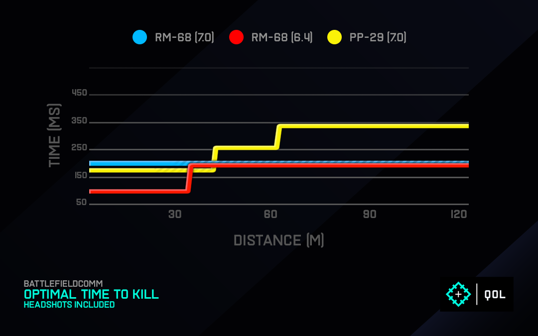 As an example of these changes, with the above red line, the RM-68 is using High-Power Ammo with the old 2.15x Headshot Multiplier from Update 6.4. The difference in optimal TTK at close range is shown here, versus the same RM-68 build now showing the updated multipliers in blue and PP-29 in yellow.