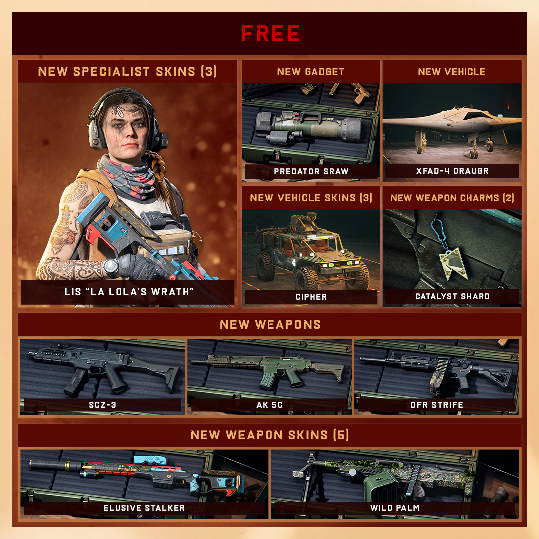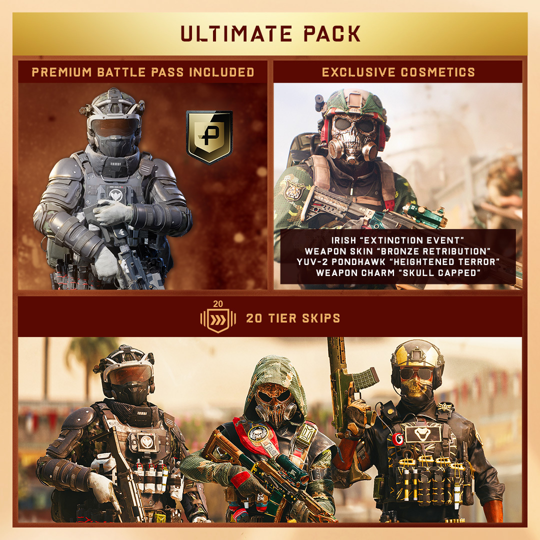 Discover the ultimate way to jump into Season 7 with the Battle Pass Ultimate Pack. The pack contains the Premium Battle Pass, 20 Tier Skips to progress faster, the exclusive ""Extinction Event"" outfit for Irish, the ""Bronze Retribution"" M5A3 Weapon Skin, the ""Heightened Terror"" YUV-2 Pondhawk Vehicle Skin, and the ""Skull Capped"" Weapon Charm.