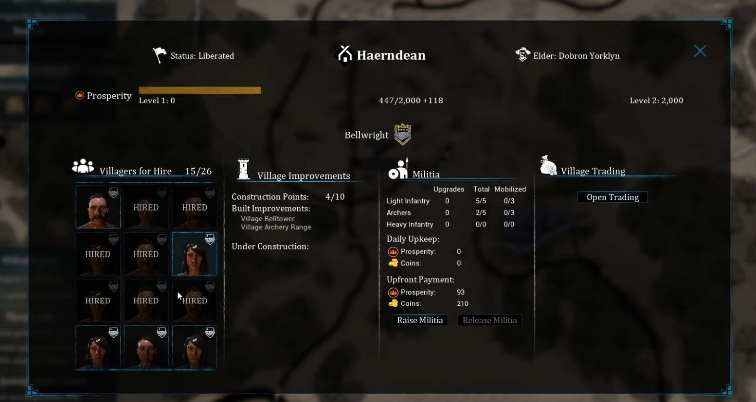With the new village status you can see all the potential villagers for hire, what improvements you’ve added, and the current militia available to help you defend the territory.