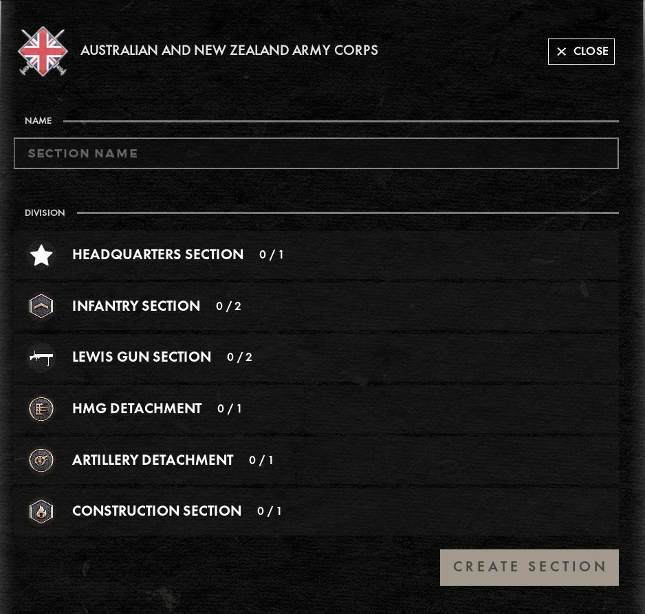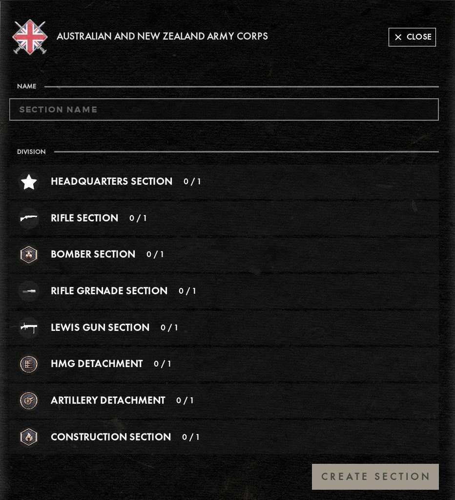 Following the evolution of other armies during the war, the ANZAC forces saw their section types change to meet the changing landscape of the conflict. Differing from the other BEF units, the ANZAC snipers will be found integrated into the bomber section on maps prioer to 1918. During the final year the snipers were reorganized into infantry sections. These deadly roles will make use of the brand new SMLE sniper which sets these roles apart from others within the Empire.