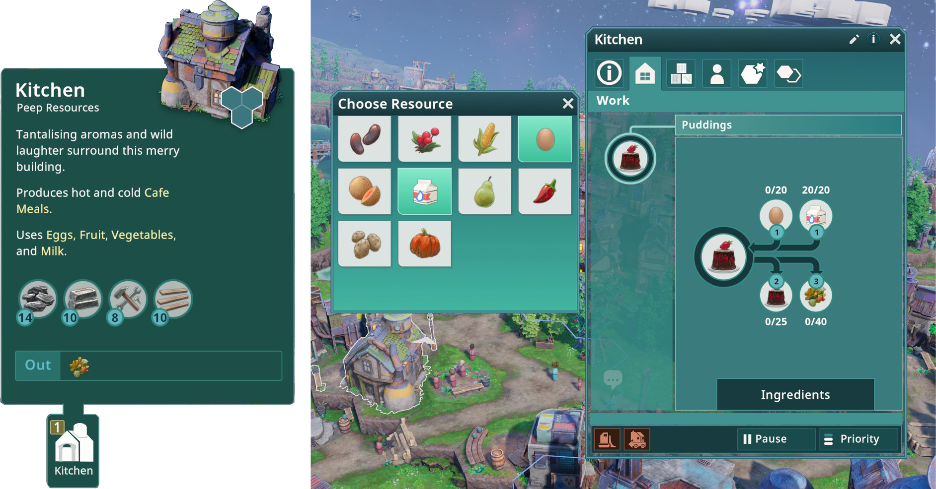 There are several different meal recipes that can be created through different combinations of ingredients: in the screenshot above, Eggs and Milk combine to make Puddings (and some Food Waste by-product). We don’t tell you what these recipes are, so you’re encouraged to play around with them and find out!