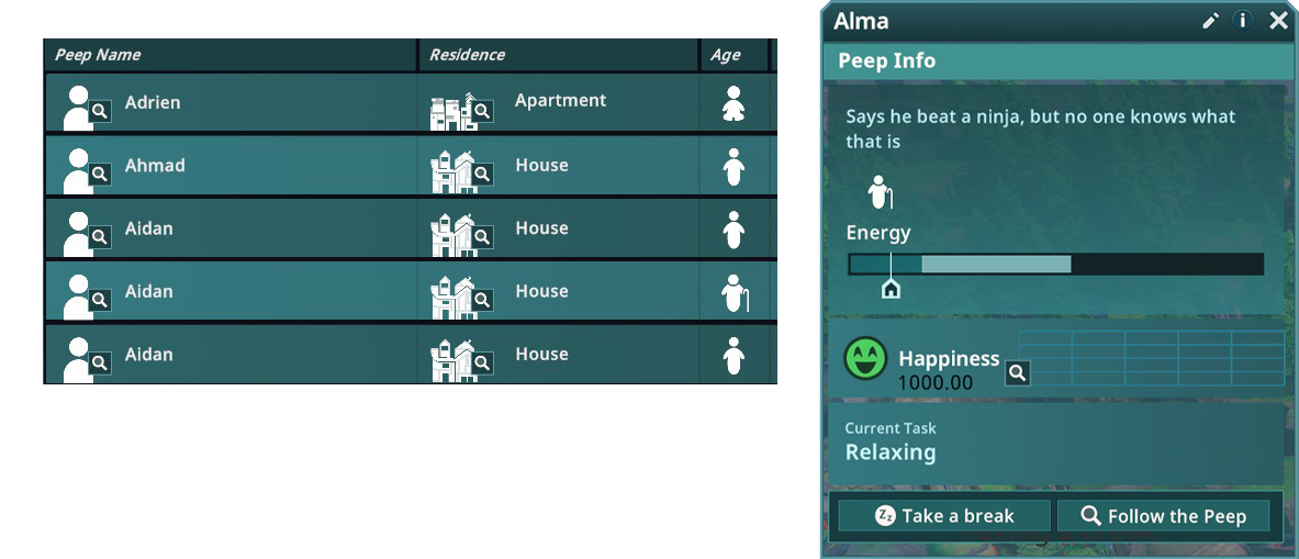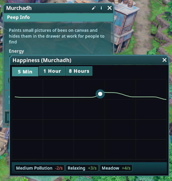We’ve briefly touched upon Peep Happiness in a [url=https://store.steampowered.com/news/app/2295060/view/4585314779419720228?l=english]previous diary[/url]; it’s a mechanic that influences various things from productivity to, uh, reproductivity. Happiness goes up when Peeps are relaxing, eating, drinking, or being near decorative buildings. It goes down while Peeps are working, and dips even further if they pass through a polluted tile (the heavier the pollution, the greater the rate that happiness decreases). If a Peep is unhappy enough, they will stop working and immediately seek ways to address their poor mood - so basically, keeping your Peeps happy means they’ll work longer. To help track Peep happiness, we’ve added a graph to show the player what’s caused changes to a particular Peep’s happiness at a given time: