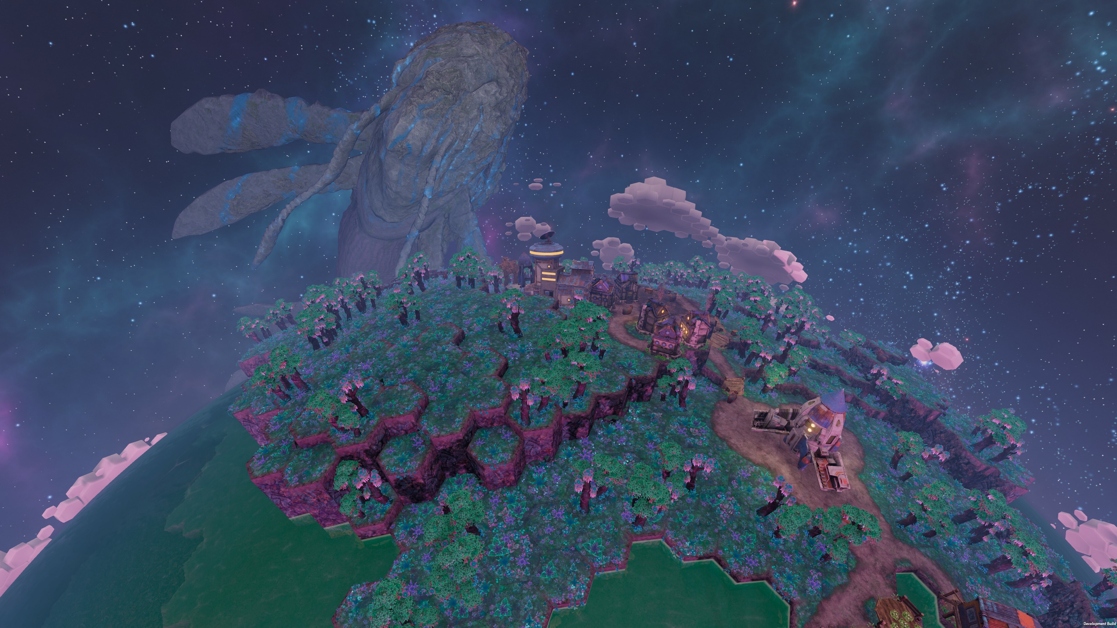 In [i]Beyond These Stars[/i], Kewa is always your main ride. From a gameplay perspective, we don’t intend for players to divert too much of their attention from our space whale friend; rather, settleable planets largely function as outposts that reinforce the core gameplay on Kewa’s back. The range of resource types available on Kewa is intentionally limited. You’ll always have access to the materials needed for basic buildings that sustain life & a certain degree of population growth, but more advanced buildings will require you to wade further through the depths of space - to explore beyond just these stars, if you will. (heh) Interstellar travel introduces you to planets with unique biomes and unusual resources. These new planets will expand gameplay by unlocking new resource types - which in turn are necessary to build new, more advanced buildings back on Kewa. There are further gameplay and narrative implications here, but we’ll be covering those in greater detail later.