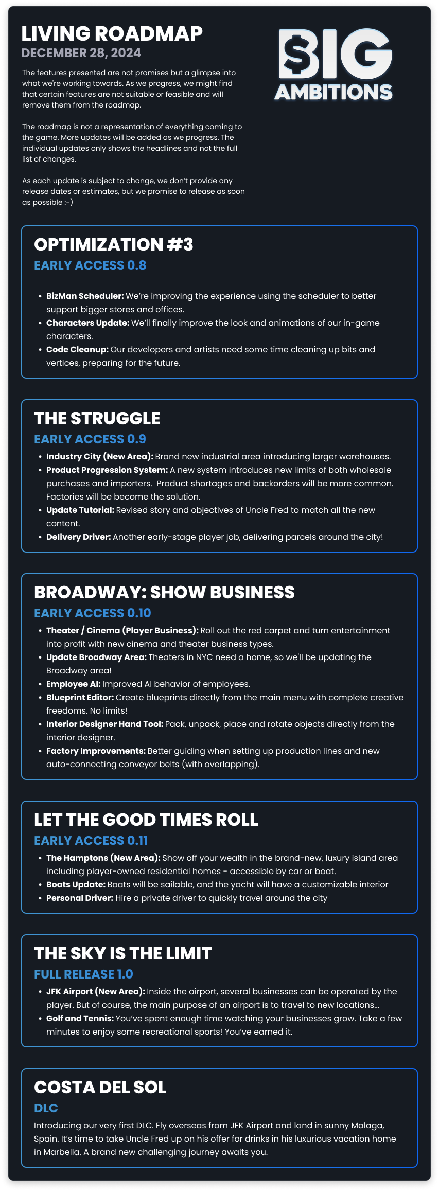 Our [url=https://www.bigambitionsgame.com/roadmap/]Living Roadmap[/url] has been updated to reflect our plans leading up to the full release of Big Ambitions. You'll notice that we've added "Full Release" to the list. While this is not set in stone, it reflects our plan to stay in Early Access for at least another 12 months. [url=https://www.bigambitionsgame.com/roadmap/]