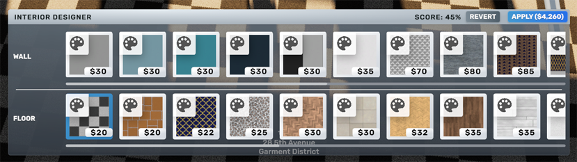 Next, when you open interior designer, you'll see your current interior score. This should help you know where you currently stand, so you're not just blinding upgrading your walls! And finally, to complete the experience, there are new wall and floor variations to choose from.