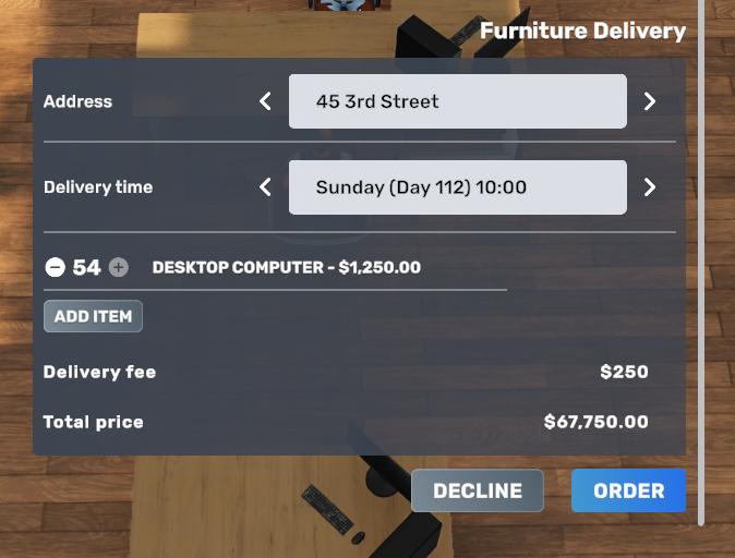 The Graphic Designer operates similarly to the Law Firm and Web Dev agency, but in addition to the regular computer workstation, Graphic Designers can demand a few new items found at Mr. Scott's Office Supply Store: