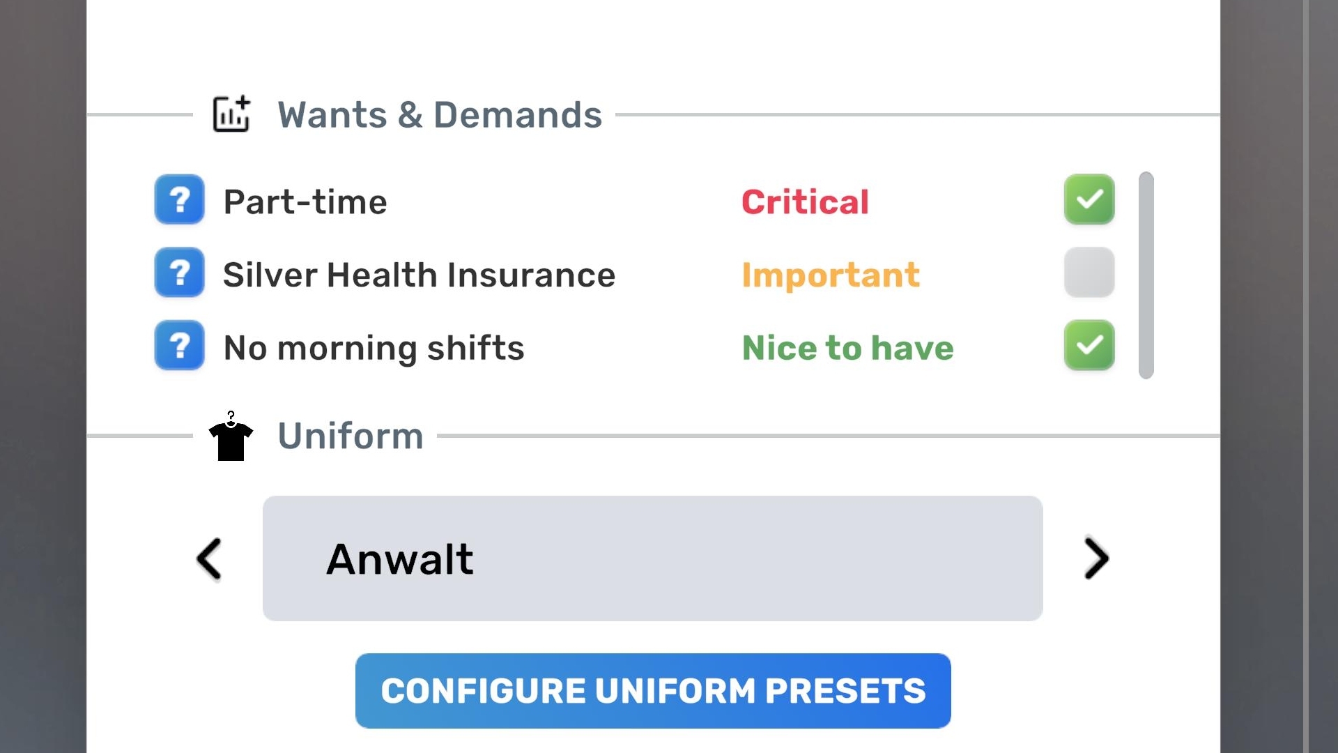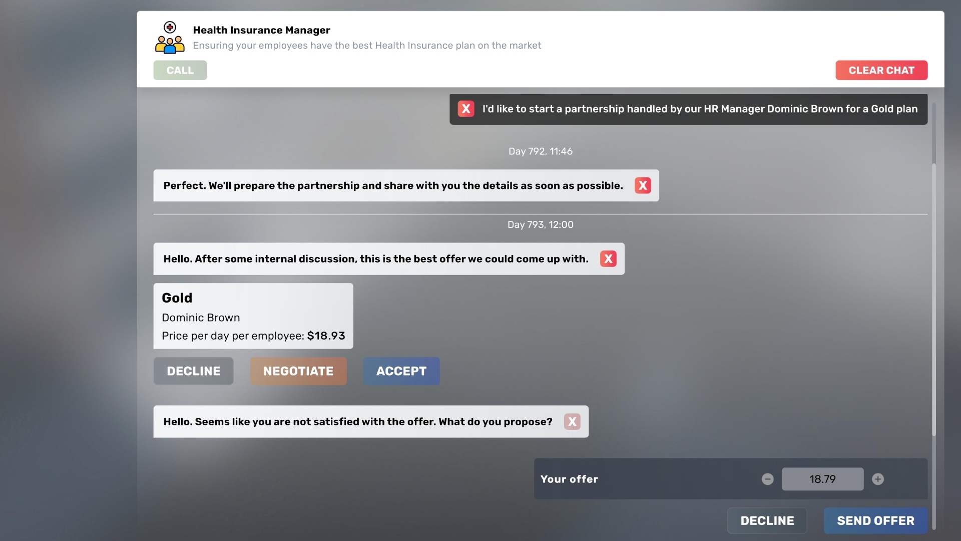 Speaking of being healthy - that brings us another new feature - now each of your HR Managers can manage a contract with the hospital to get health insurance for the employees they manage. Be sure to visit the hospital to set your employees up with an insurance plan.