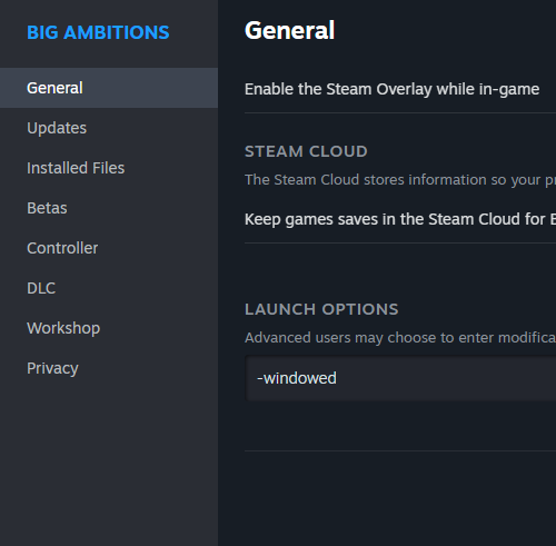 - Right-click on Big Ambitions in Steam and go to "Properties"