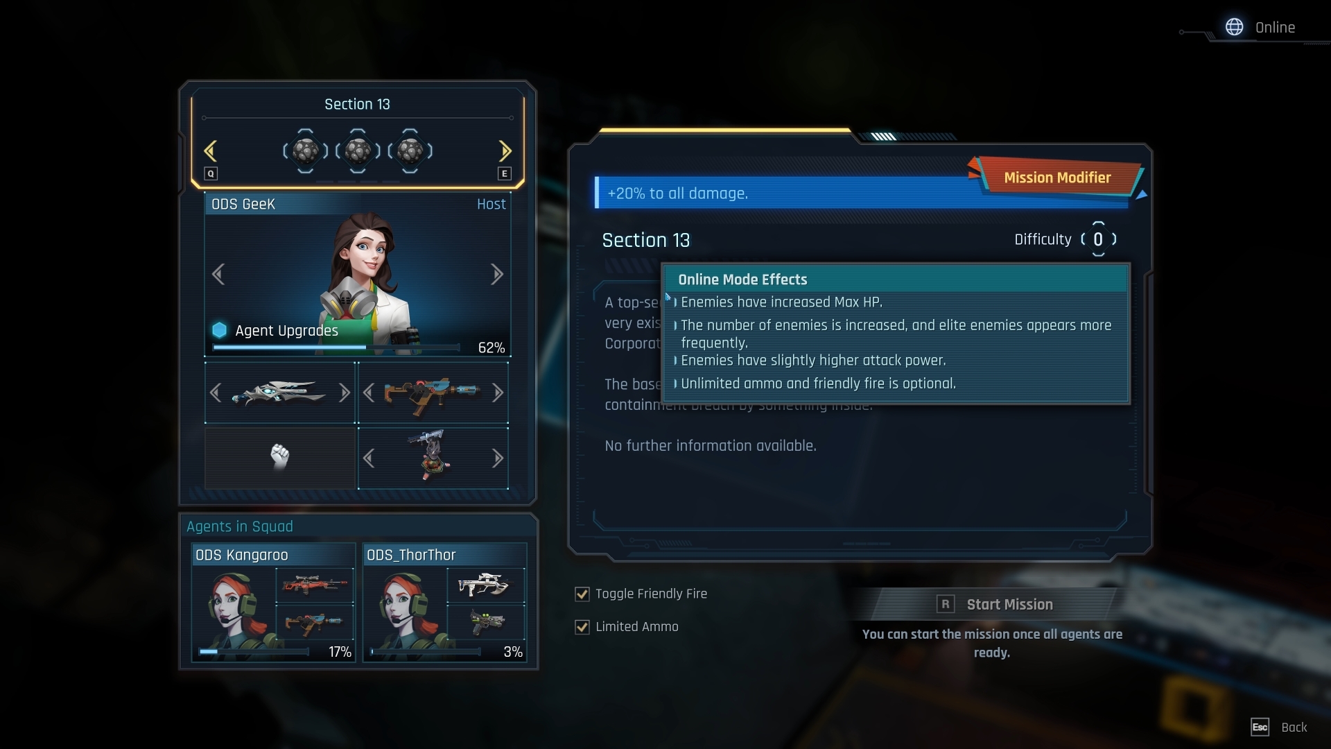 - Mission preparation screen displays the online mode effects tooltip