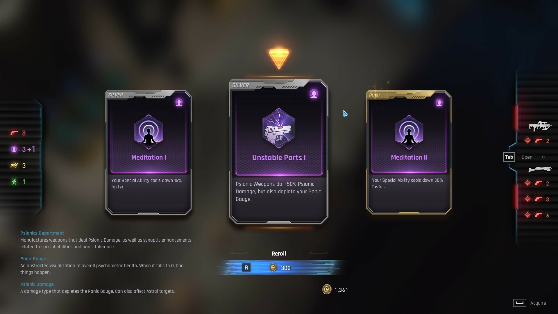 - Revenue Share (R&D): Boosts physical/psionic damage of weapons while your credit balance is over a certain threshold