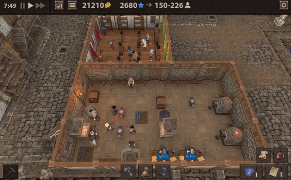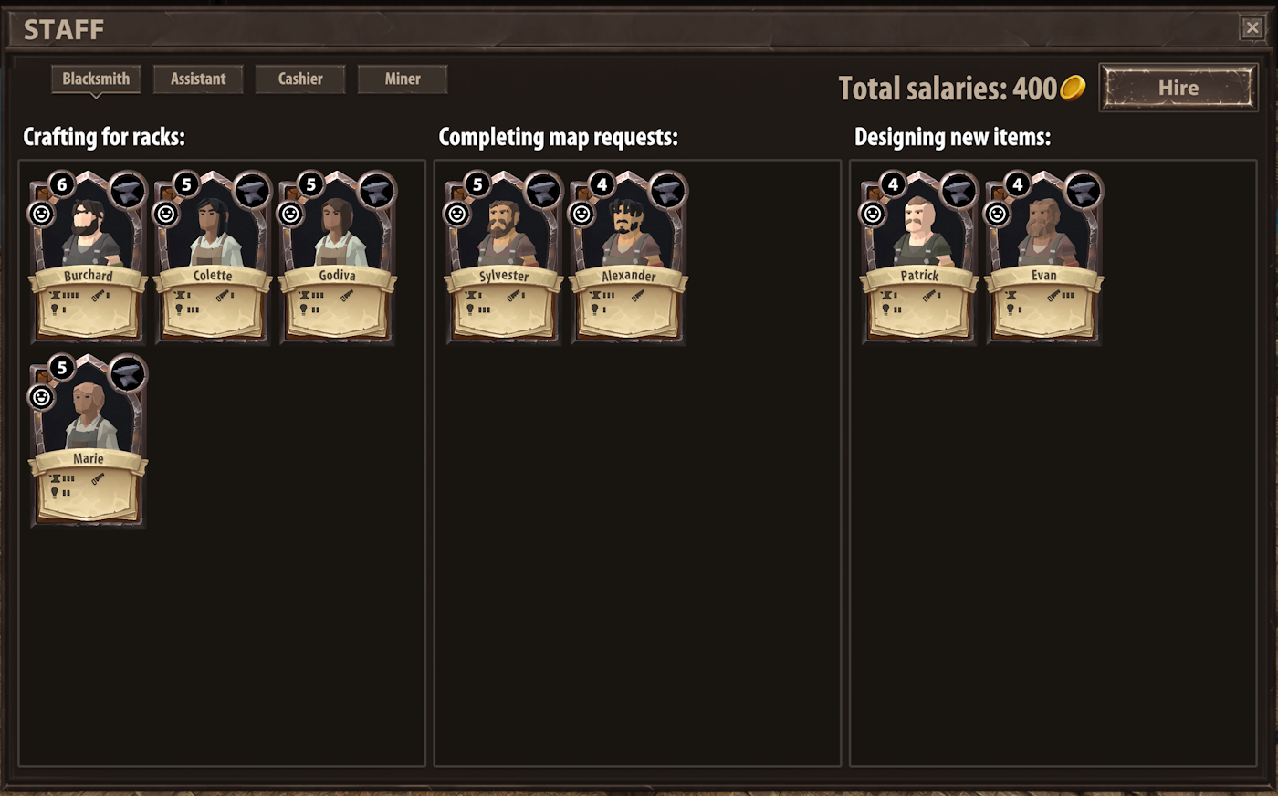 I've also streamlined the staff popup where you'll be able to drag&drop staff into certain roles. Each staff type will have different responsibilities, and you're job is to make sure the workshop is balanced. For example, a blacksmith can either craft items for racks, craft items for the kingdom map requests or work on designing new items. If you have too many blacksmiths designing, you'll be spending too much money on their salaries while racks will be empty and you won't be able to help your kingdom enough. On the other hand, if you're focusing just on production, but not on unlocking new items, you won't be able to fulfill certain requests.