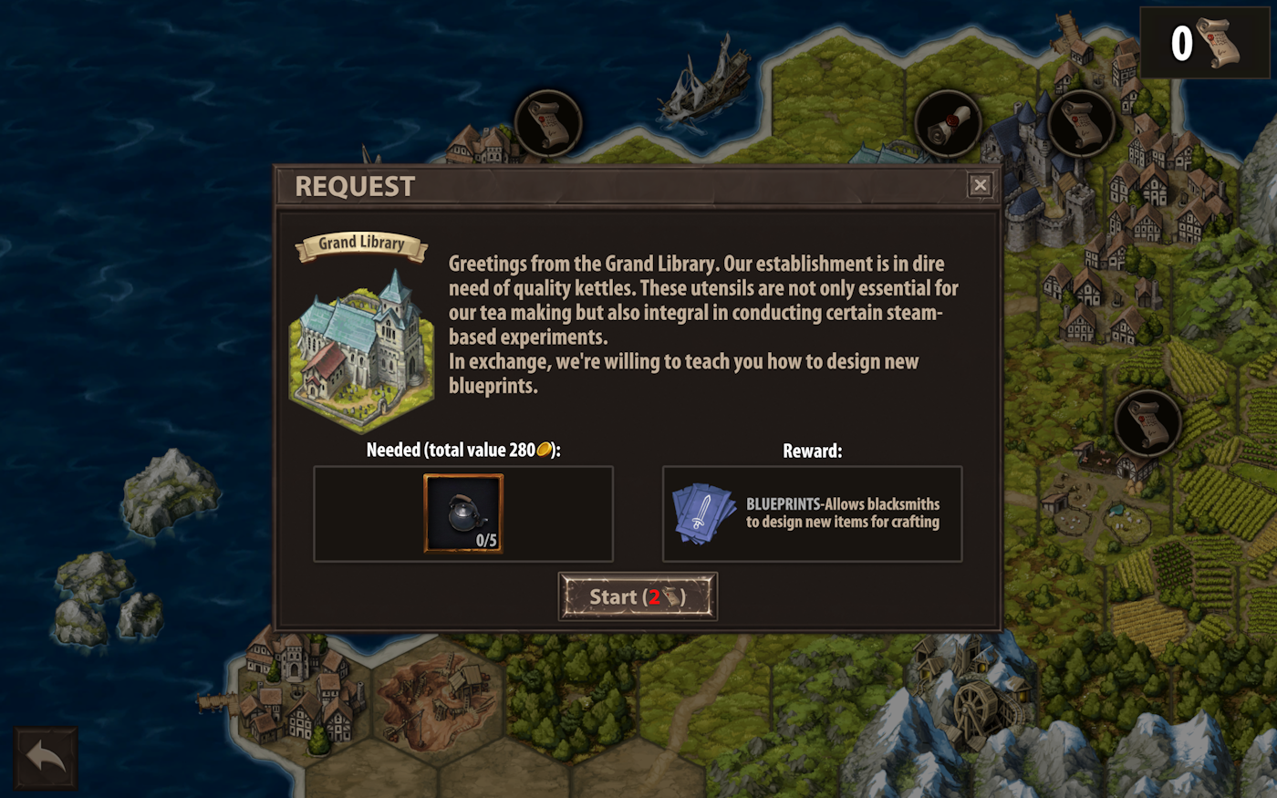 In order to improve that, I've replaced the research tree with a map of the kingdom where you're located. Since you're managing a blacksmith shop, you can influence events happening in the kingdom by providing weapons, tools, armor or something else. You can also help you kingdom expand either by force or diplomacy and in return receive certain benefits, bonuses, or materials.