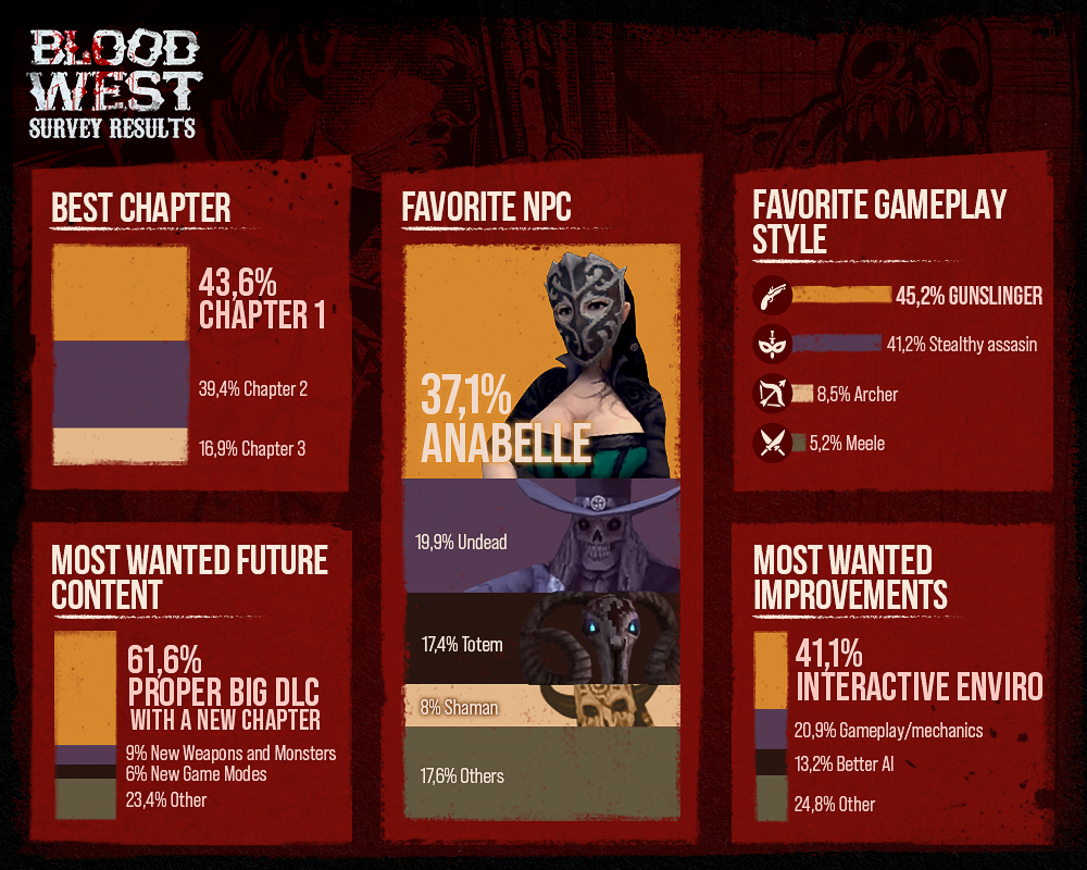 Anabelle won by a landslide and we ain’t surprised! We fell in love with the gal while she was still a concept art during the development of the second chapter of Blood West and we wanted her to be the poster-girl of the second chapter. That wouldn’t be possible of course without Ivy Wilde. She did done a fantastic job of bringing the character to life and on that note each and every voice actor did a phenomenal job.[b] In case you were wondering who is the voice behind your favorite NPC, here is a neat little homage we made for them. [/b] [previewyoutube=A2LsU9J7NPE;full][/previewyoutube]Best Chapter