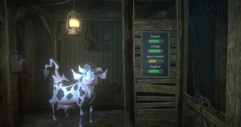 The cow has four essential needs:[b] food, sleep, moo-vement[/b] (yes, she needs to stretch her legs), and, least importantly (and least gracefully), [b]hygiene[/b]. Fortunately, she’s a mostly autonomous creature—she’ll eat if there’s food, nap when tired, and wander outside if the gate is open. You don’t need to micromanage her, but if you do meet her needs consistently, she’ll reward you with steady milk production.