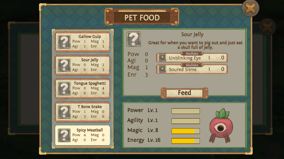 We've added in pet food (with different recipes requiring boss parts), which lets you level up your pets! Each stat has a different effect and value, Power increases their base attack, agility increases their frequency of attacks, magic increases the power of their specials, and energy increases the length of buffs or shortens the CD of their special depending on which special your pet has.