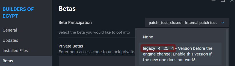 The previous version of the game, based on [b]Unreal Engine 4.25[/b], has now retired to a dedicated [b]legacy branch[/b]. This option is available for players who, for any reason, cannot or do not want to switch to UE 5.6 (for example, due to lack of DX12 support). To switch to the legacy version: [olist] [*]Right-click on [b]Builders of Egypt[/b] in your Steam library. [*]Select [b]Properties[/b], then go to the [b]Betas[/b] tab. [*]In the dropdown, select: [b]legacy_4_25_4[/b] [*]Steam will download and install the previous version. [/olist] [i]The legacy branch will remain available indefinitely, but will no longer receive updates or fixes.[/i]