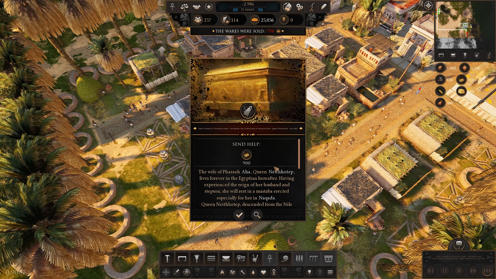 Scripted main events have appeared in which there are various tasks to complete. Usually these will involve delivering or collecting products, but in later missions where more mechanics are revealed, things get a lot more interesting. [b]What do scripted events mean? [/b]Firstly, they will not always appear during the game. Sometimes the player has to "overdo it" [annoy Pharaoh and you'll quickly see what I'm writing about here] to trigger an event or reach the appropriate level of city development. When such an event is triggered, it must be completed to complete the mission. Completed does not mean successful, an event can just as easily fail and then it is also completed. And what effect this has on the rest of the game you will find out in the full version!