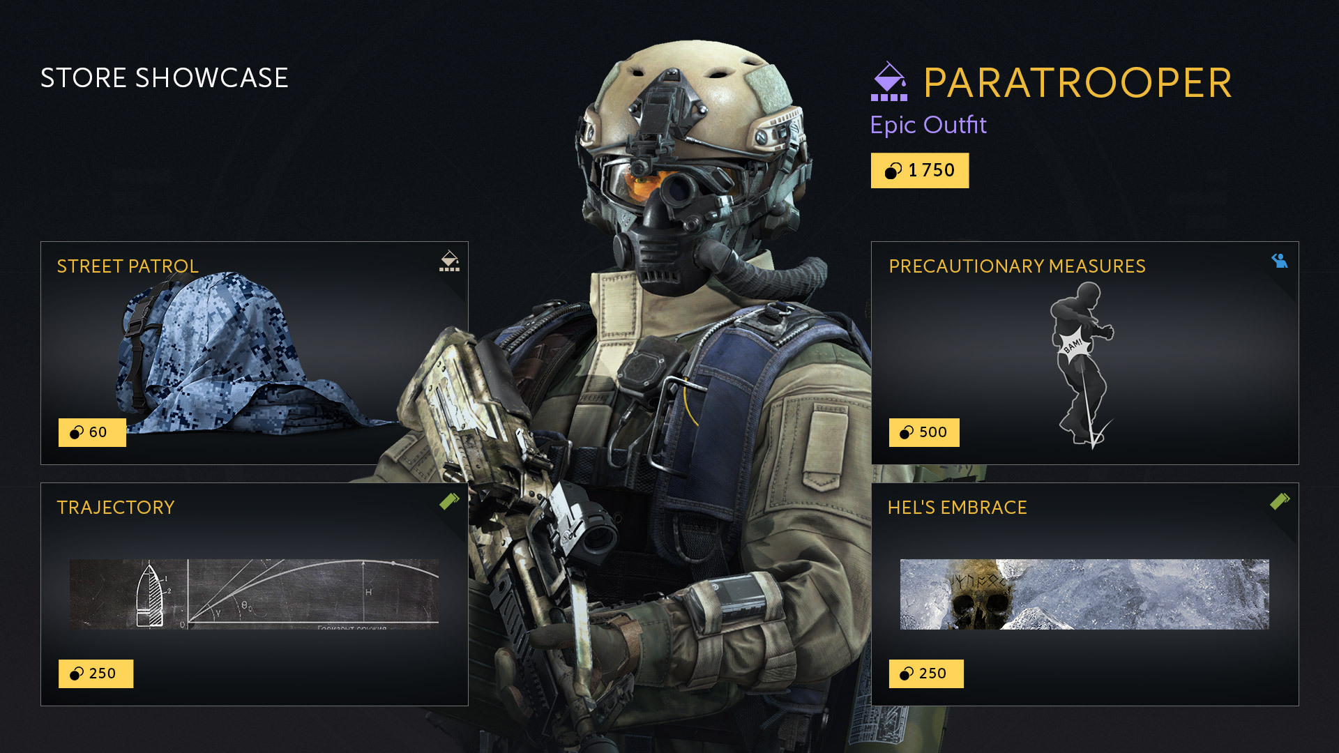New content: the Paratrooper Epic Outfit for Support Sputnik, the Precautionary Measures Emote, the Street Patrol Camo, the Trajectory and Hel's Embrace Emblems.
