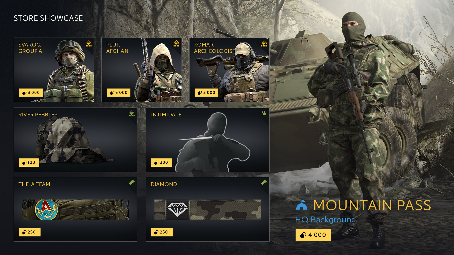 New content: three Legendary Outfits with a discount, the Mountain Pass HQ Background, the “Intimidate” Emote, the River Pebbles Camo, the Diamond and The A-Team Emblems.