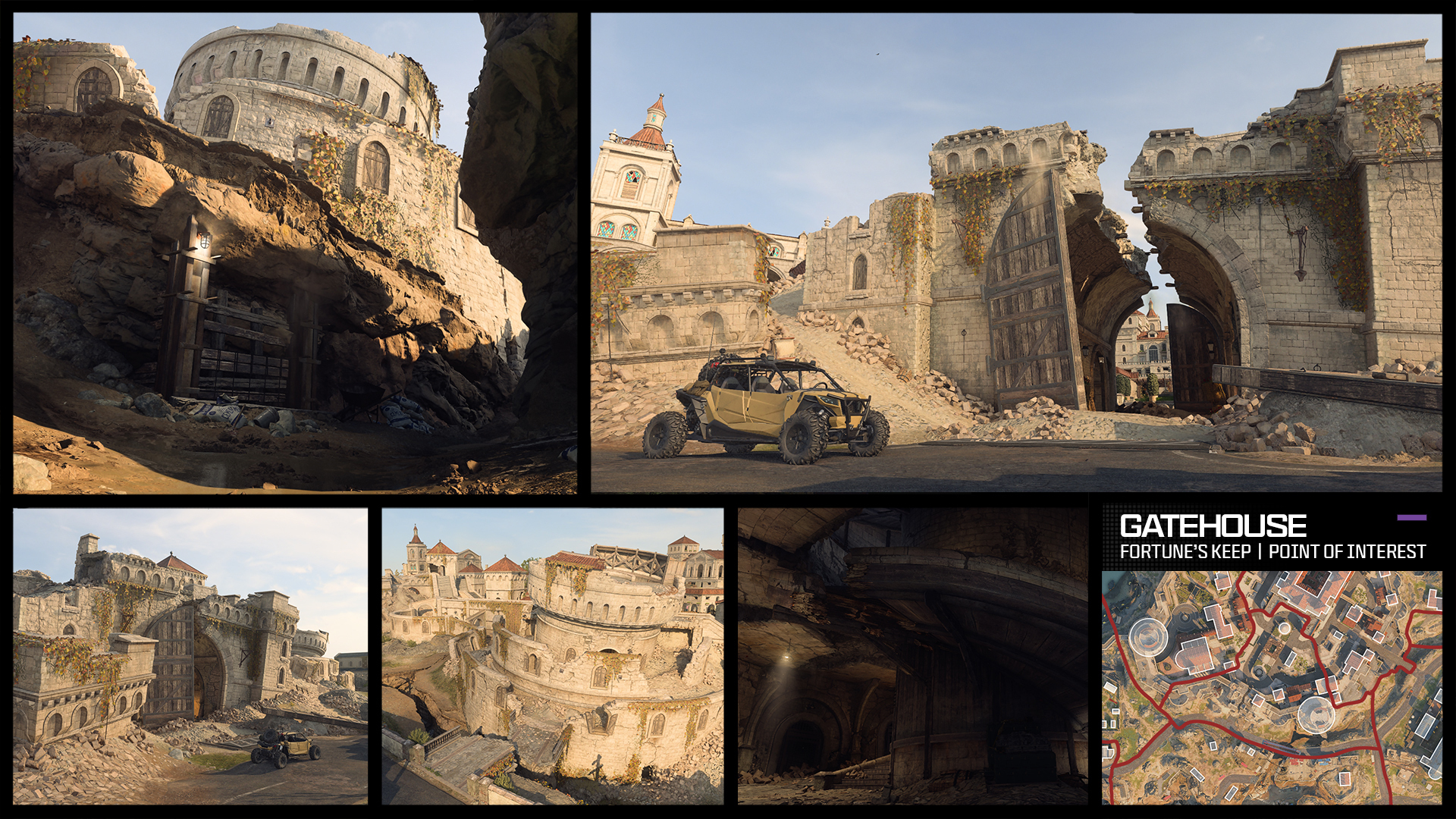 The true extent of the damage caused by an apparent colossal subterranean explosion is most visible when investigating the Keep Gatehouse in the center of the map. The ramparts, multiple turrets, the arched entrance, and the barbican (the circular outer defensive tower) has sustained major damage, with the barbican itself sinking into the unstable ground below.