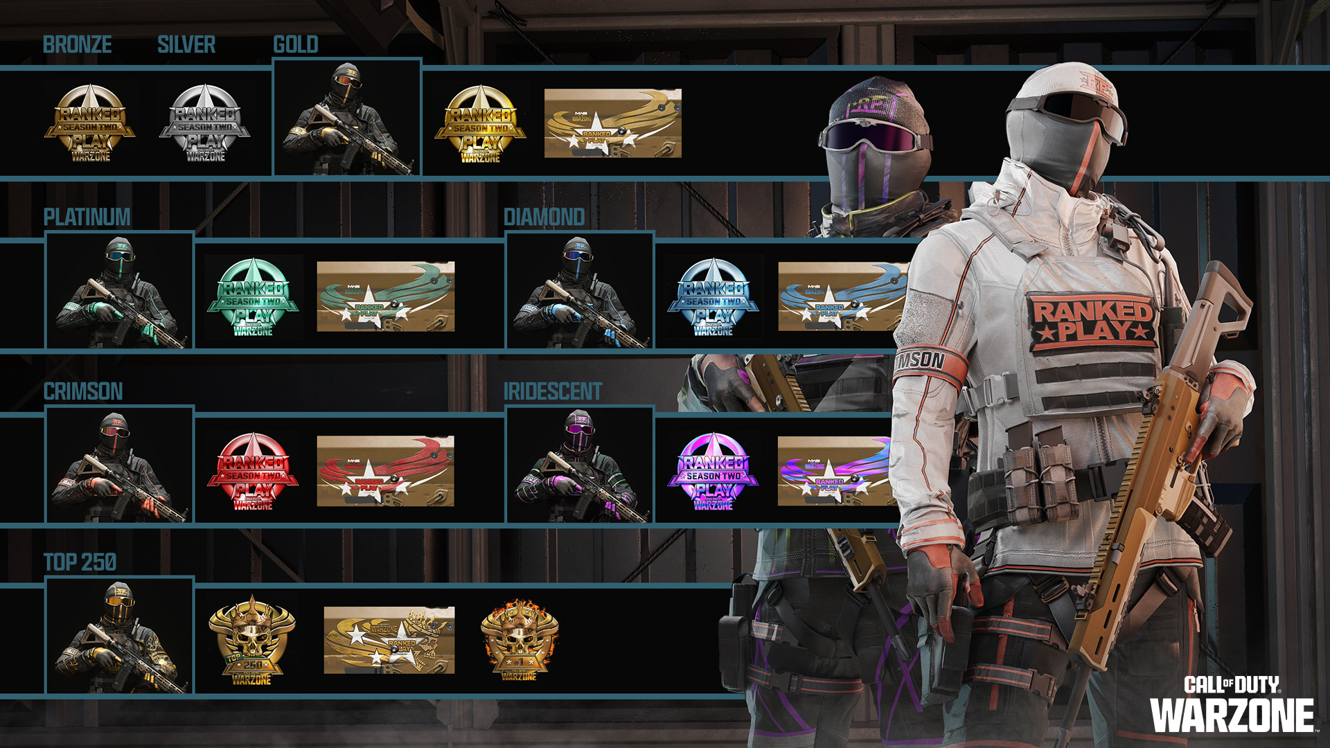 [b]Rank 50:[/b] Calling Card, “WZ Ranked Veteran” Animated Emblem and four Operator Skins.