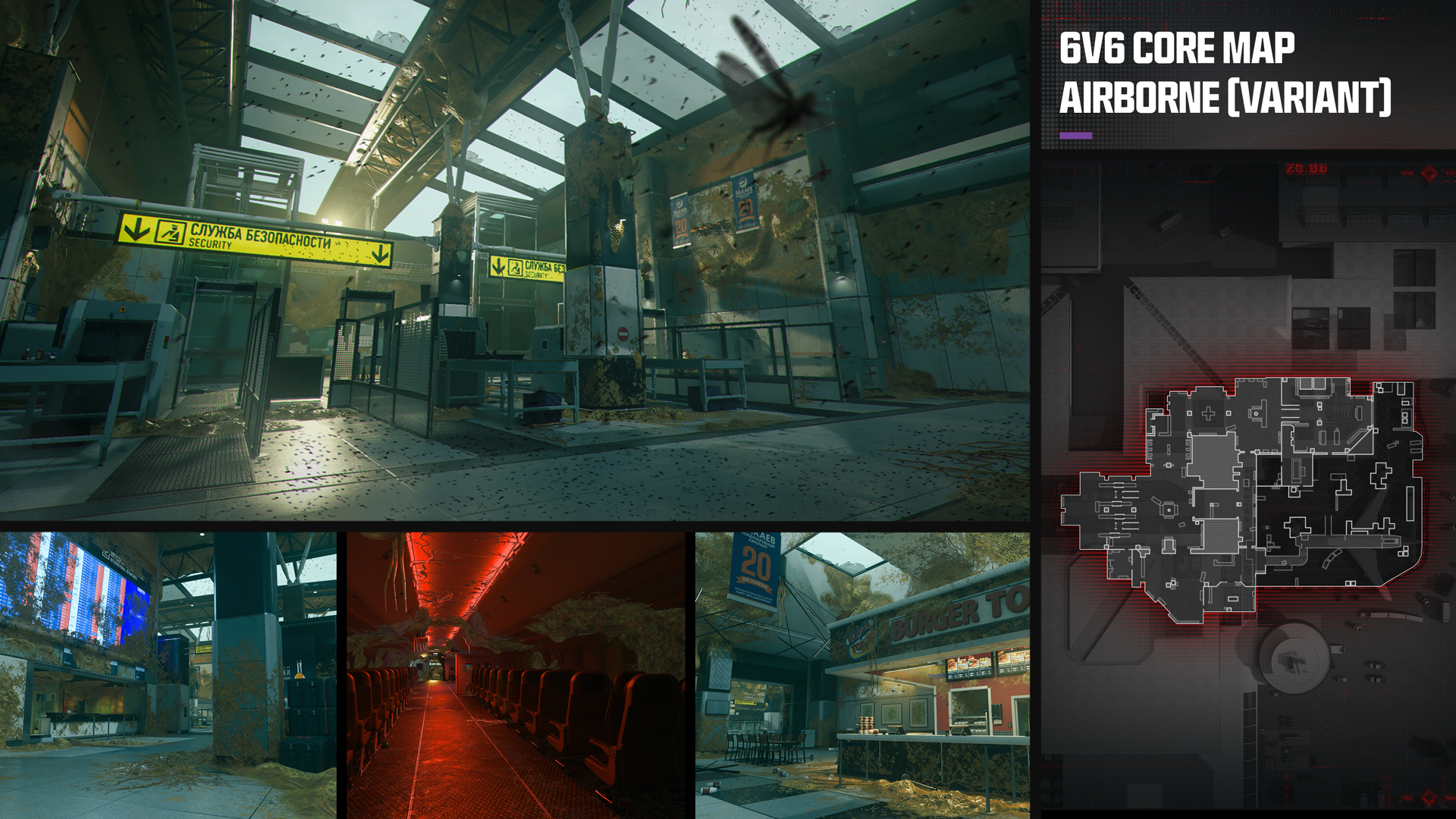 Explore the Departures area of the Zakhaev International Airport, a clean and competitive 6v6 map with areas for all ranges of combat. The map is larger than Terminal, so expect the action to be both rapid and tactical, with Operators accessing a central main lobby comprising a west-side ground-level exterior entrance, main luggage check-in and thoroughfare, and an upper mezzanine walkway and security zone along the map’s eastern side. Set up impressive sightlines of varying heights and distances, maneuver across the numerous cover points, or face down foes in close-quarter combat within the Restaurant, Cosmetics Store, or Burger Town.