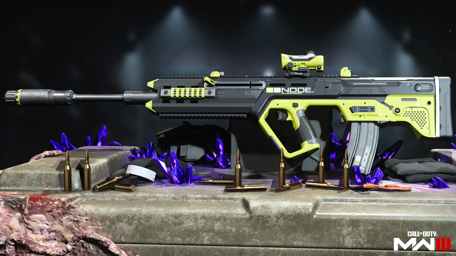 Conduct stealth operations with this lime green and black Weapon Blueprint featuring a suppressor to keep you off the radar while firing along with enhanced damage and recoil control for added stability. Trade its sleek look for something more sinister using the BlackCell variant.