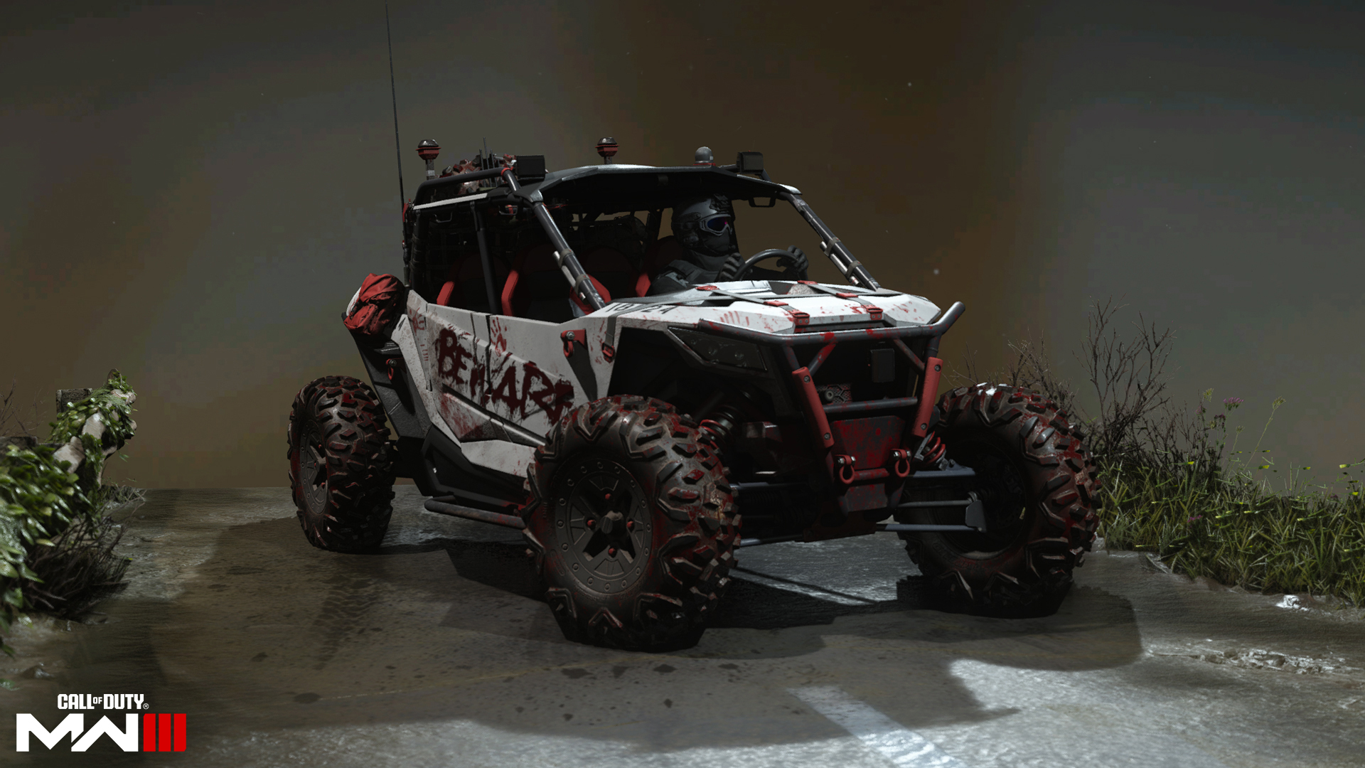 Carve offroad paths and send enemies fleeing in terror with this white, black, and red UTV Vehicle Skin emblazoned with the word ‘Beware’ written in blood across its doors.