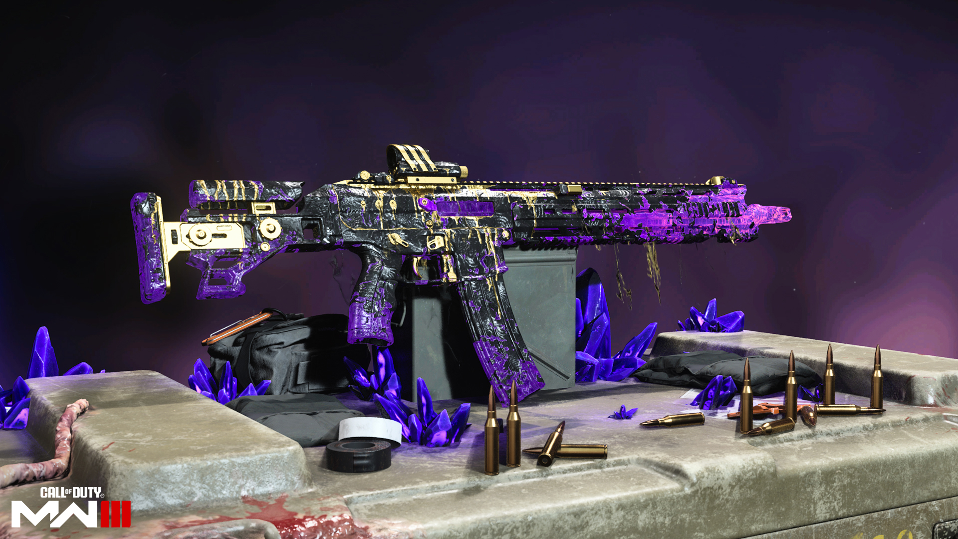 Based on the new Season 2 Assault Rifle, this otherwise sleek Weapon Blueprint has been tagged up and bloodied. Keep the enemy at bay with a hefty 45 round Magazine complimented by a recoil control-enhancing attachments and a 2.5x magnification Optic for mid-ranged precision. Swim in a sea of black gold with its BlackCell variant.