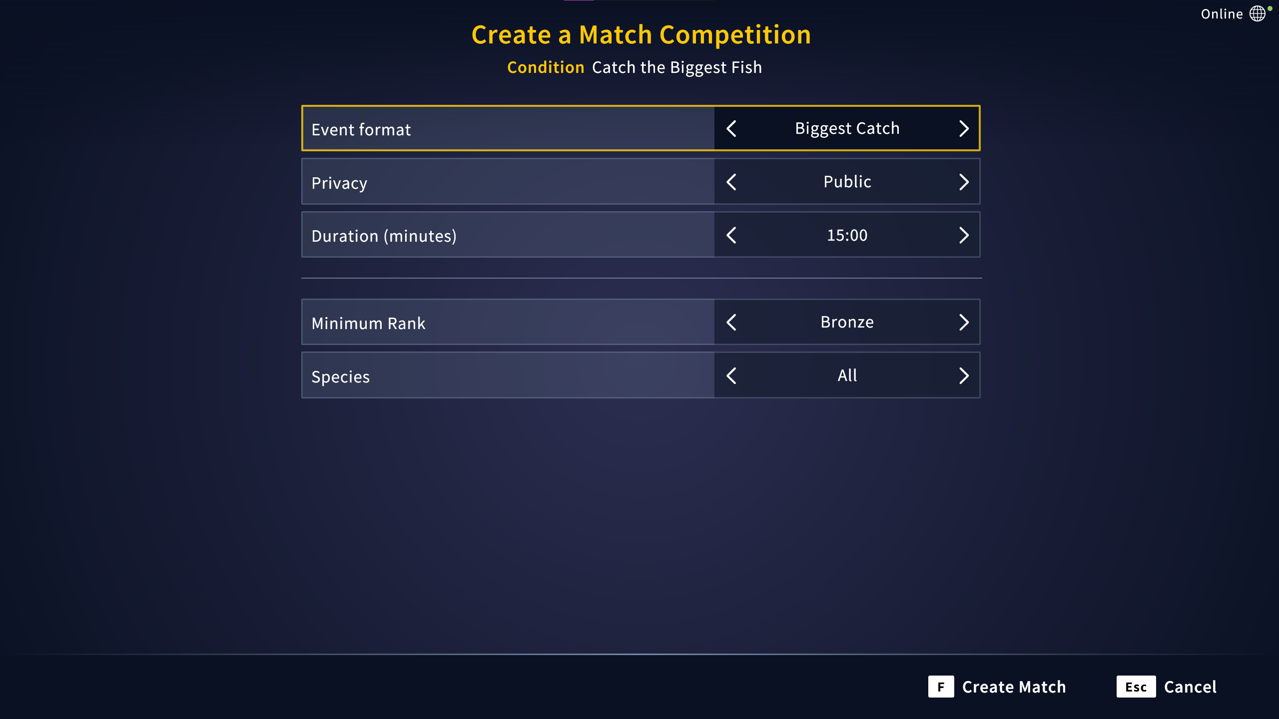 You can then press 'Create a Match' and can proceed to choose Event Format, Privacy, Duration and catching criteria for the competition with the Minimum Rank & Species options.