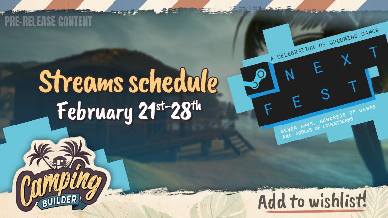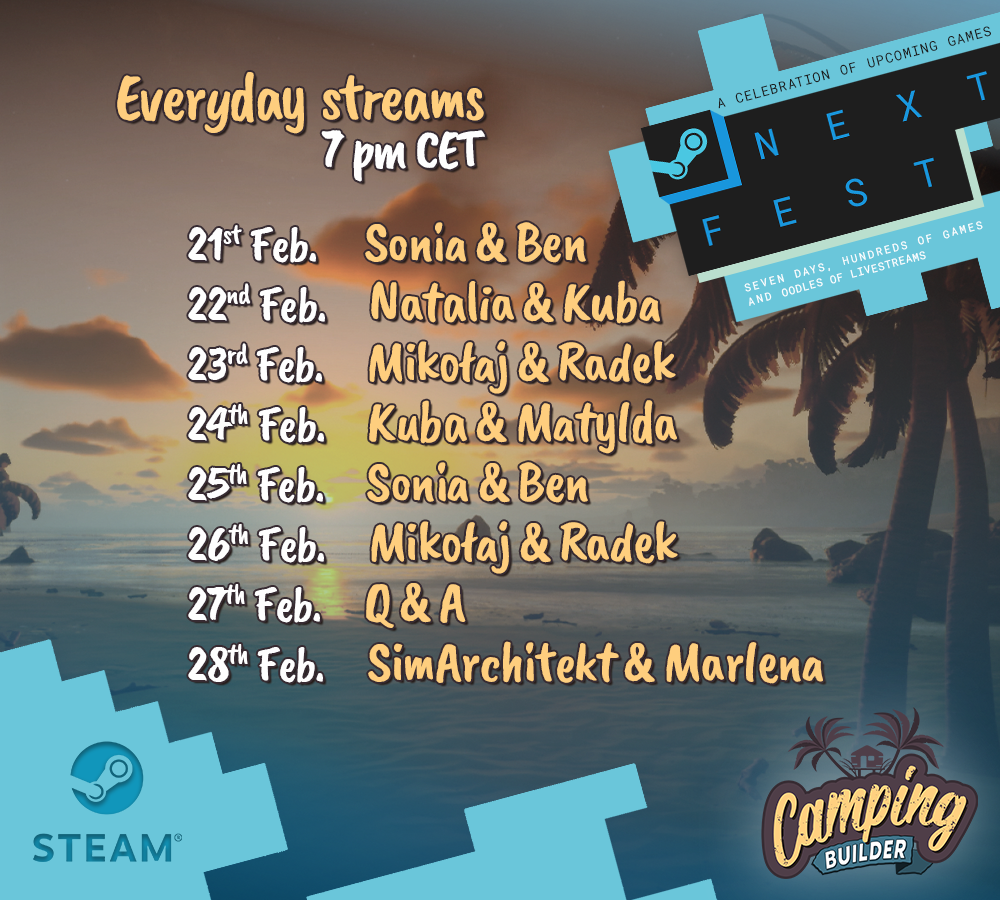 The Steam Next Festival is an 8-day long celebration of Indie games, with hundreds of great demos available to play. We are kicking off the Festival with the [b]Camping Builder streams, Q&A, and a competition![/b] [b]Tune in at 19:00 each day[/b] of the celebration to watch the video premiere on Steam. But don’t worry if you miss a video. We will be playing all of them on loop for the entire day after the premiere.