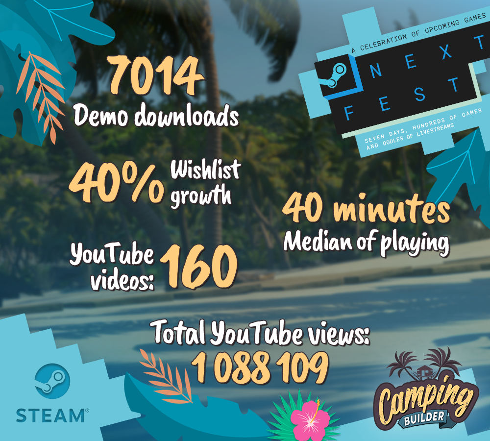 The [b]Camping Builder[/b] demo was very well received among the simulator genre and by other gaming fans on Steam. We’ve enjoyed countless hours of your live streams and had lots of fun going through all the YouTube videos we found of your gameplays. Of course, you also gave us feedback, which is the most valuable thing we could get from you. For all that, [b]we thank you![/b] Some of the game demos featured during this edition of the Festival were of really high quality, and it’s a pleasure that our small game could be seen in the company of such titles.Here are some Camping Builder festival statistics for you guys to enjoy!