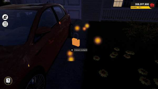 Some vehicles will be available for theft during nighttime in neighborhoods. Stealable cars will be marked with a key symbol next to them. However, don’t get too excited when you see this symbol; without a lockpick, you can’t begin the operation. Here’s where your skills come into play:- The car theft process will be performed through a mini-game.