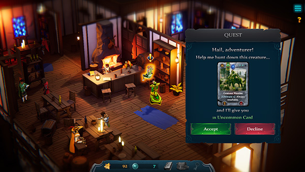 - [b]The Huntress[/b] - She's sitting at the bar in the Interdimensional Pub. She'll give you a quest to hunt down a creature for her. You may or may not encounter that creature on your next run, so this is a quest that could take multiple runs to complete. However, unlike the Innkeeper quest, the Huntress can also reward you with rare cards in return for your efforts!