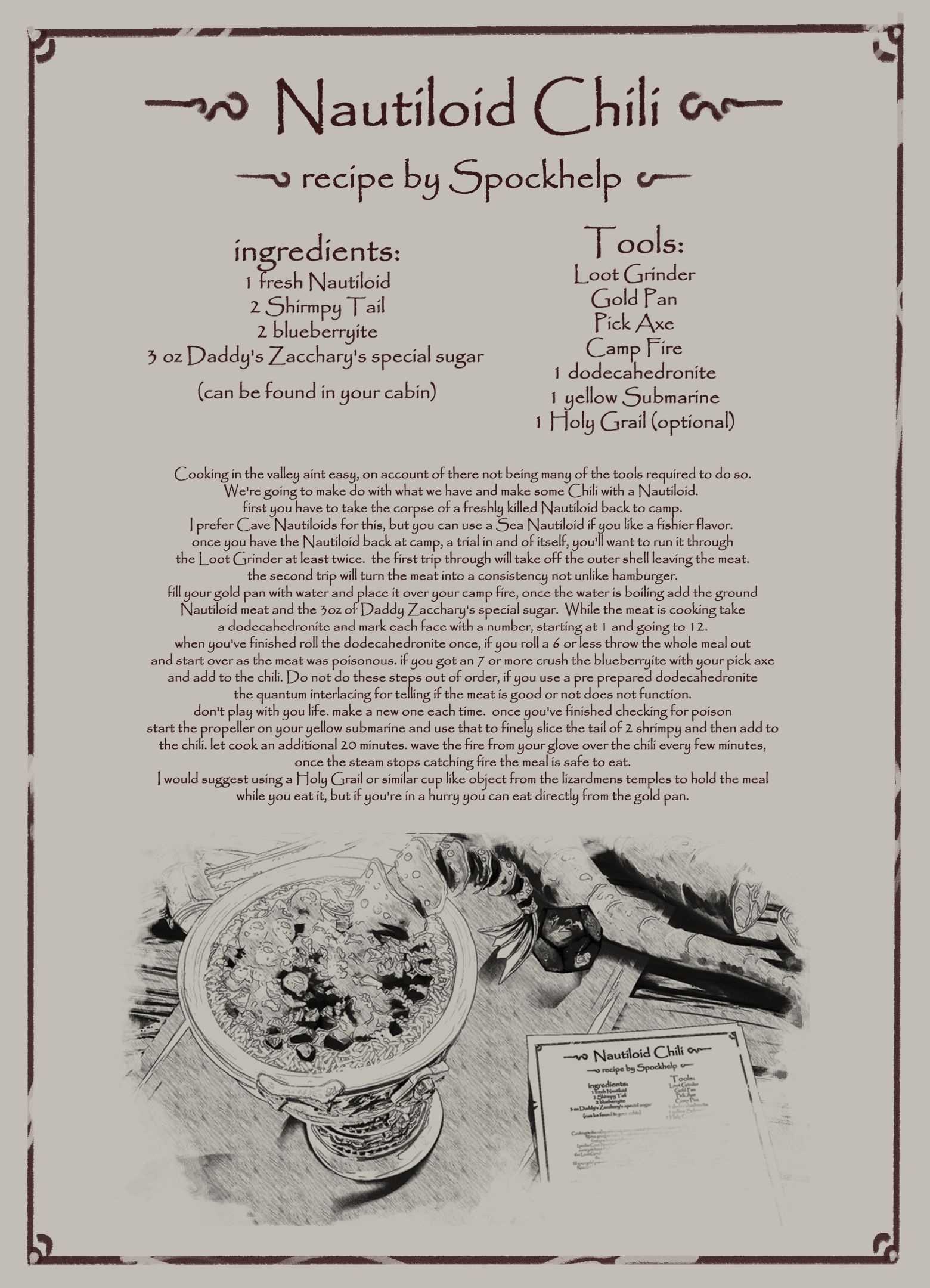 Unfortunately, there had to be only one winner in here, and it was the Nautiloid chili. It had the best ingredients, recipe structure, and story behind the recipe!