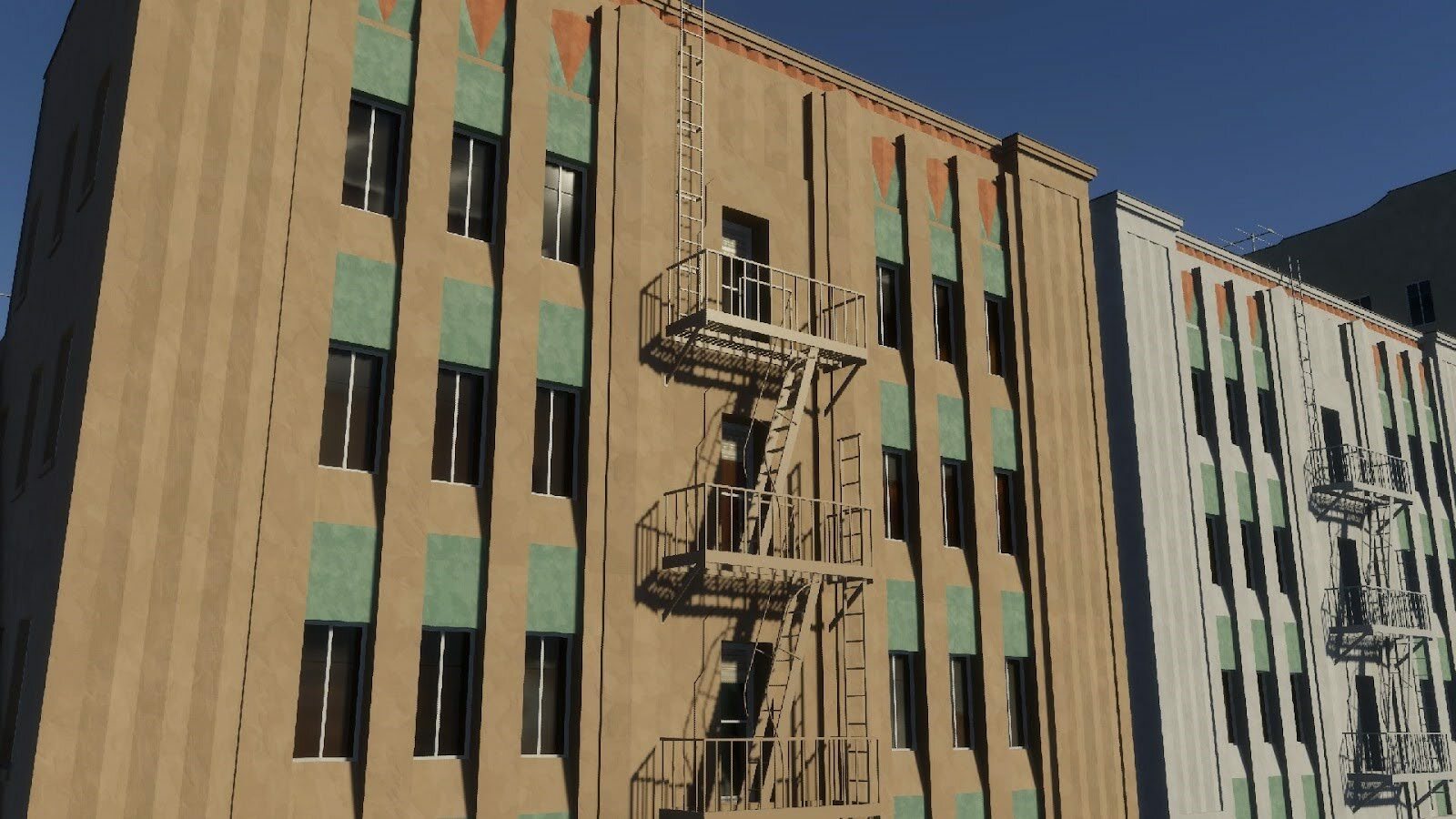 The building's almost austere Art Deco facade is broken up with the fire escape ladder, which is a very common element of facades on the West Coast. I decided to also include proper curvature of the roof as a detail that not many people might notice at first, but one that made the building feel more authentic to me.