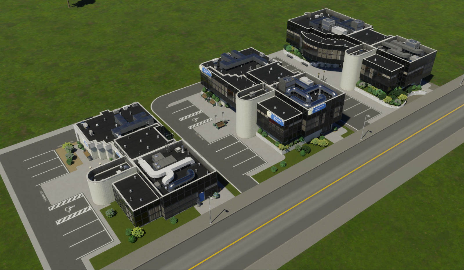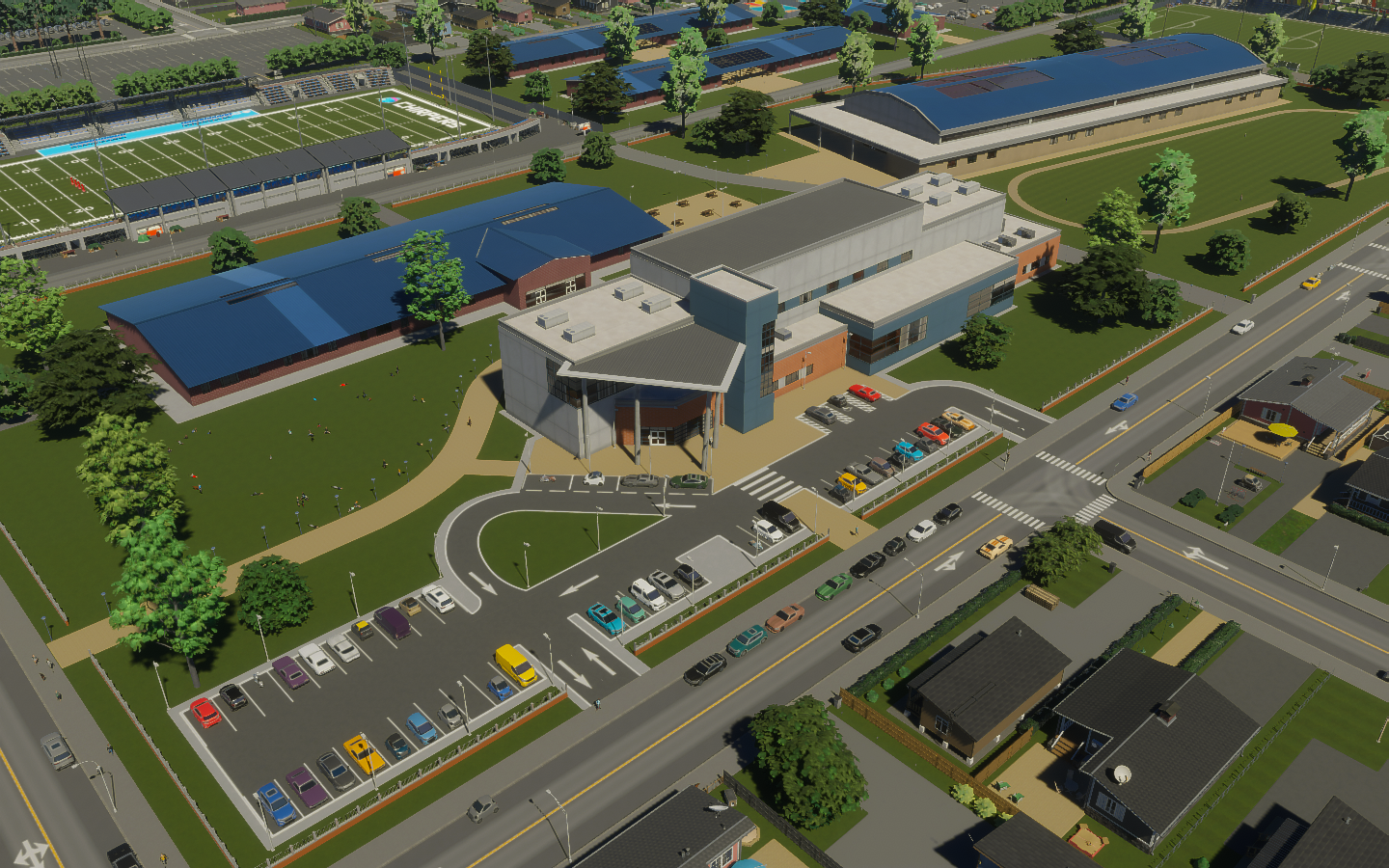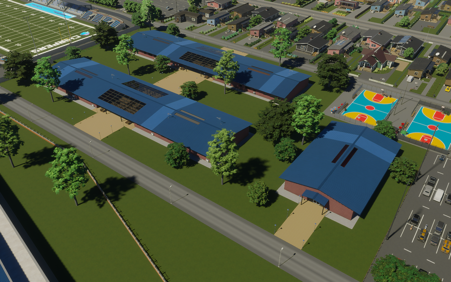 Fast-forward to later in development, after Cities: Skylines II received the update that allowed a radius to be set around the main building for placing sub buildings; I didn’t change the overall size of the main lot (I liked how wide it was!). I did, however, create a couple of variations of the sub buildings to really help shape a cool high school campus. Below, you can see the sub buildings placed further away from the main building.